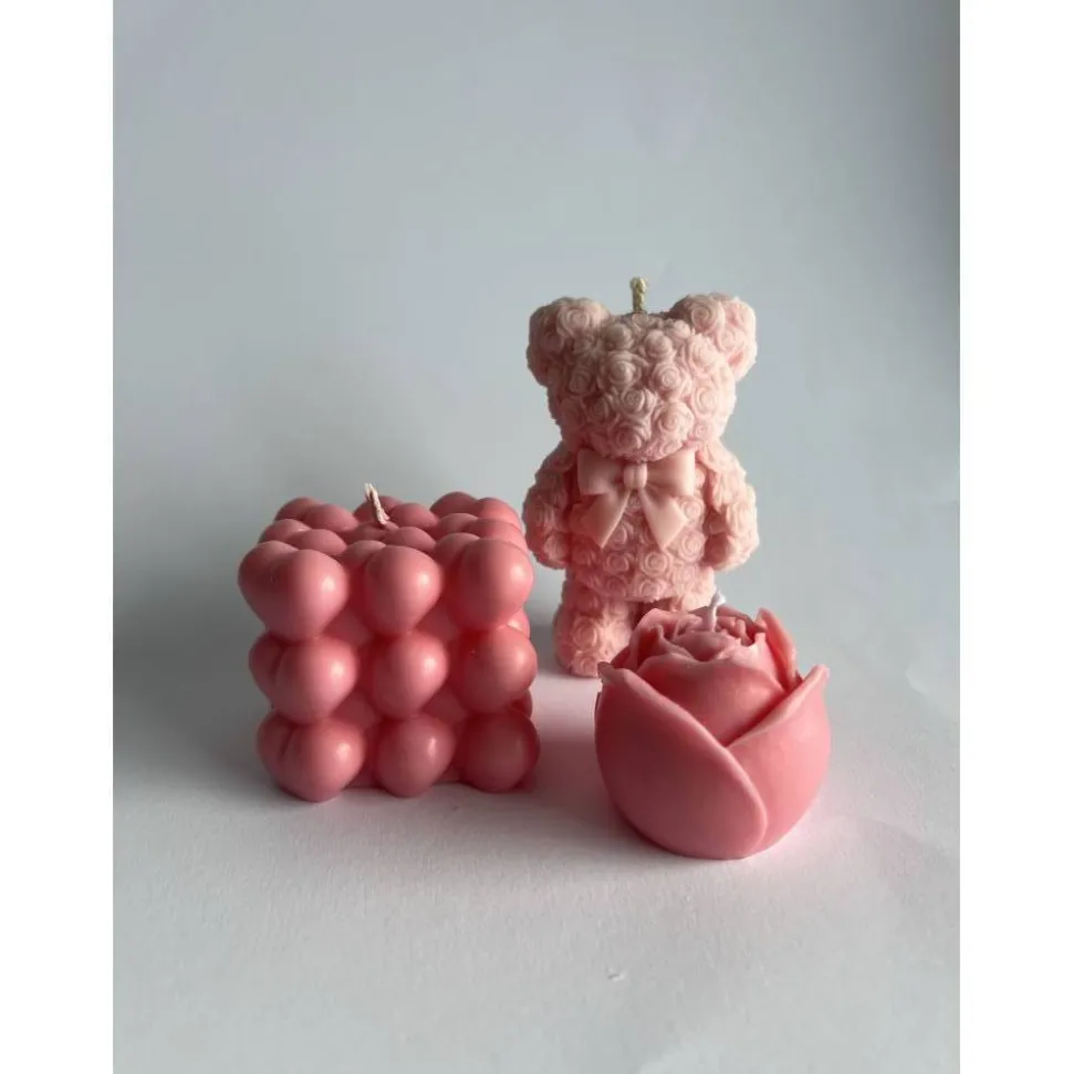 Teddybär-Kerze: Ein süßer Bär, der komplett aus kleinen Rosenblüten besteht.