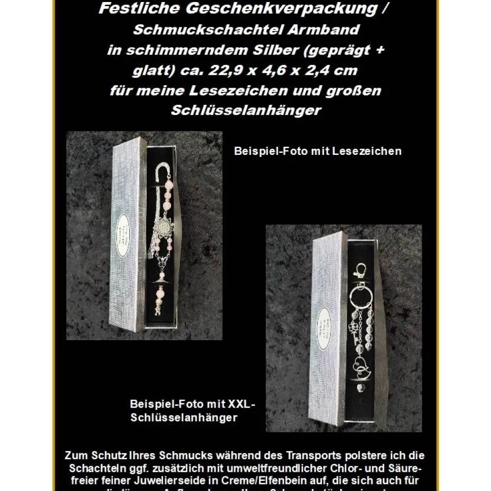 Dieses festlich schimmernde Schmucketui in Silber können Sie als Geschenk-Verpackung für meine Lesezeichen und XXL-Schlüsselanhänger (dazu) bestellen, um Ihr außergewöhnliches Geschenk besonders edel zu präsentieren. Der Deckel hat eine strukturierte Oberfläche, das Unterteil ist spiegelnd glatt.
