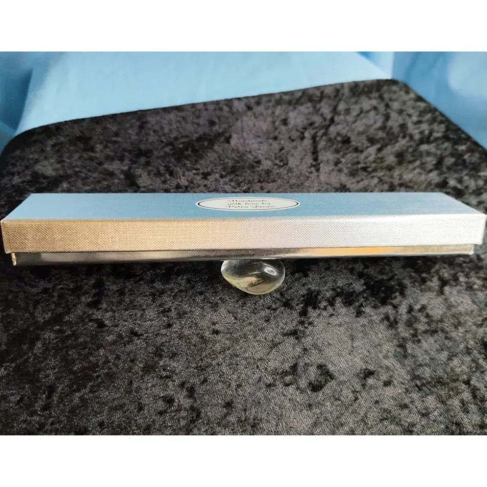 Die Schachtel ist mit einer weichen Schwamm-Einlage in Schwarz, die einseitig mit schwarzem Samt beflockt ist, und einem schwarzen Vlies ausgestattet. Für den Transport schütze ich den enthaltenen Artikel ggf. noch zusätzlich mit einem Stück chlor- und säure-freier Juwelierseide in Creme/Elfenbein, in dem Sie z.B. auch Ihre Schmuckstücke sicher für längere Zeit lagern können. Ich verschicke dieses Etui unversiegelt, so dass Sie ggf. das Seidenpapier vor dem Verschenken entfernen können.
