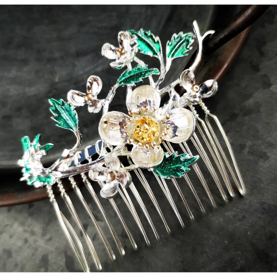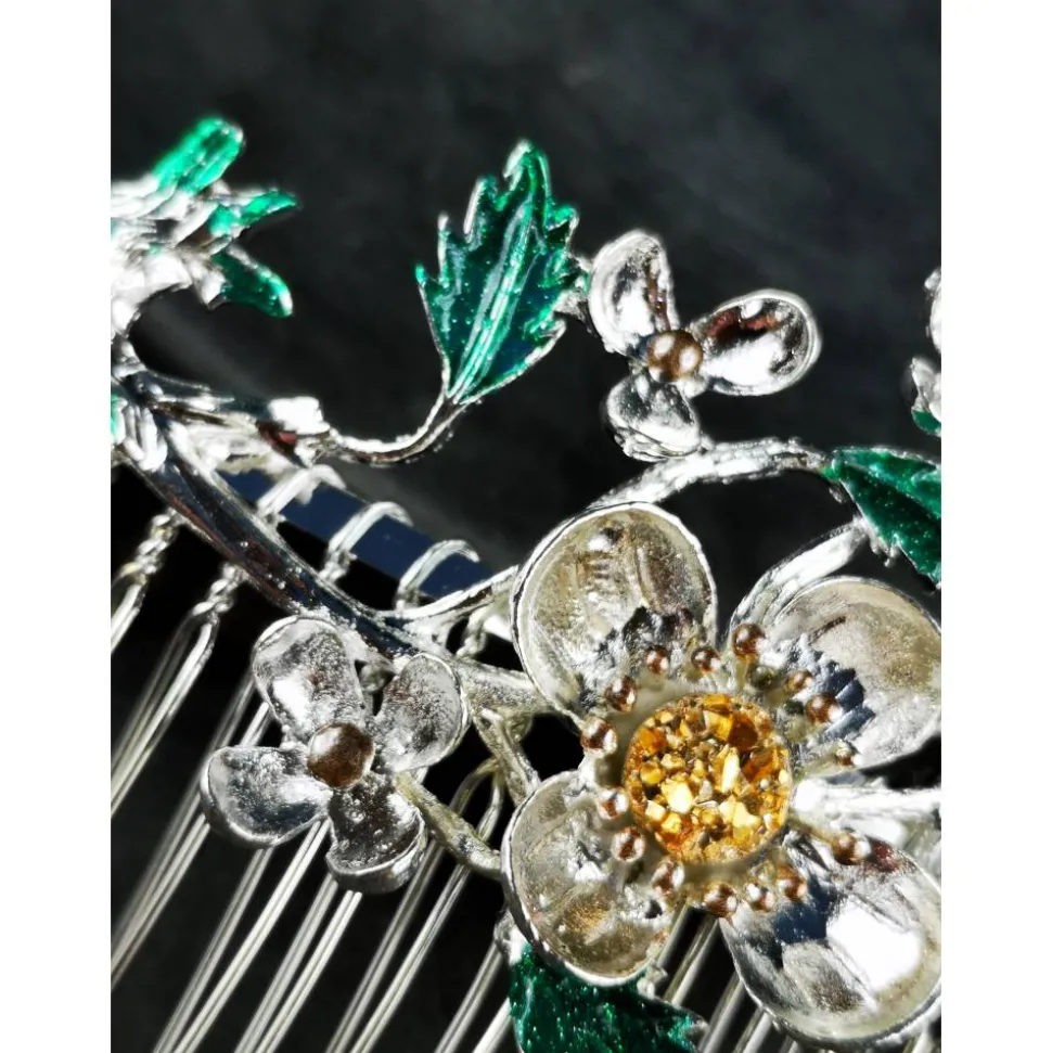 Dieser Haarkamm ist nur an den Zacken flexibel zum leichteren Einarbeiten in die Frisur. Das Ornament ist hier aus dickerem Metall (bitte nicht biegen).