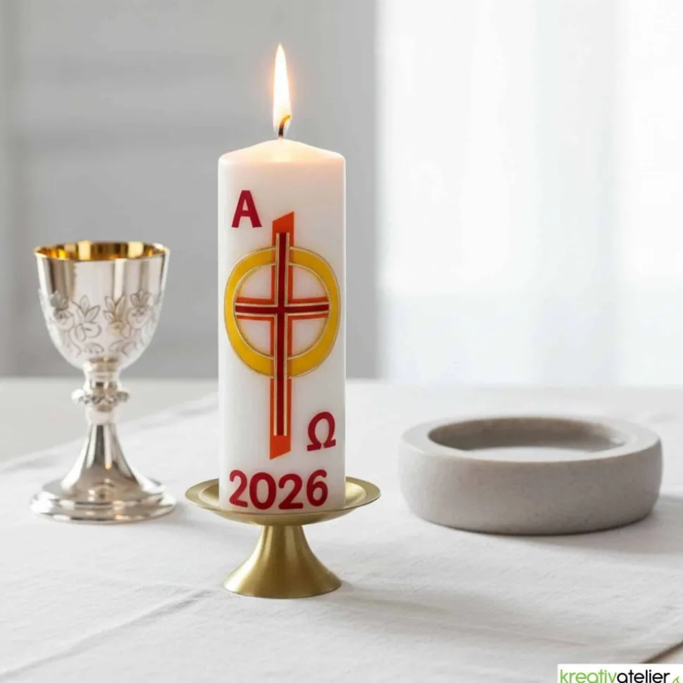 Feiern Sie Ostern mit dieser festlichen Osterkerze, die mit einem rot-orangen Kreuz und einem leuchtenden gelben Kreis mit goldenem Rand geschmückt ist. Bringen Sie damit die Botschaft der Auferstehung in Ihr Zuhause oder in Ihre Kirchengemeinde.