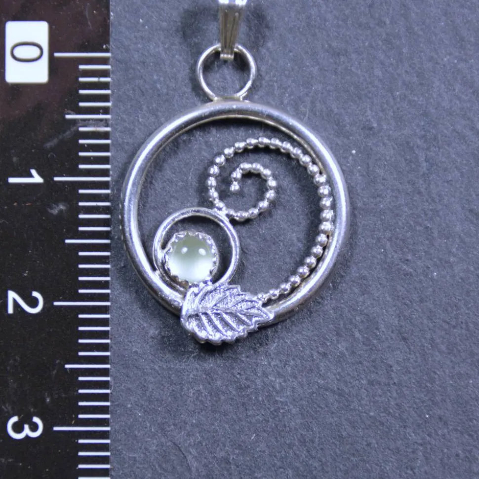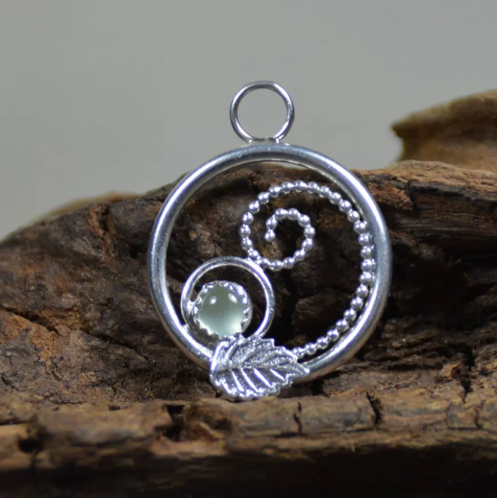 Dieser hellgrüne Prehnit, der für den Anhänger ausgewählt wurde, strahlt die Frische und Schönheit des Waldes aus. Doch das ist nicht alles – das kleine dekorative Blatt auf dem Anhänger verleiht diesem Schmuckstück eine einzigartige natürliche Note.