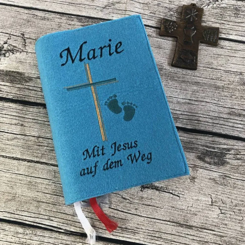 Genäht aus Filz, in Kombination mit Baumwolle, so entsteht innen ein Einsteckbereich für Trauerbildchen, Gebetskarten und kleinen Notizen. Bestickt mit einem Kreuz, Fußabdrücken, dem Name Marie und einem Spruch „Mit Jesus auf dem Weg“.