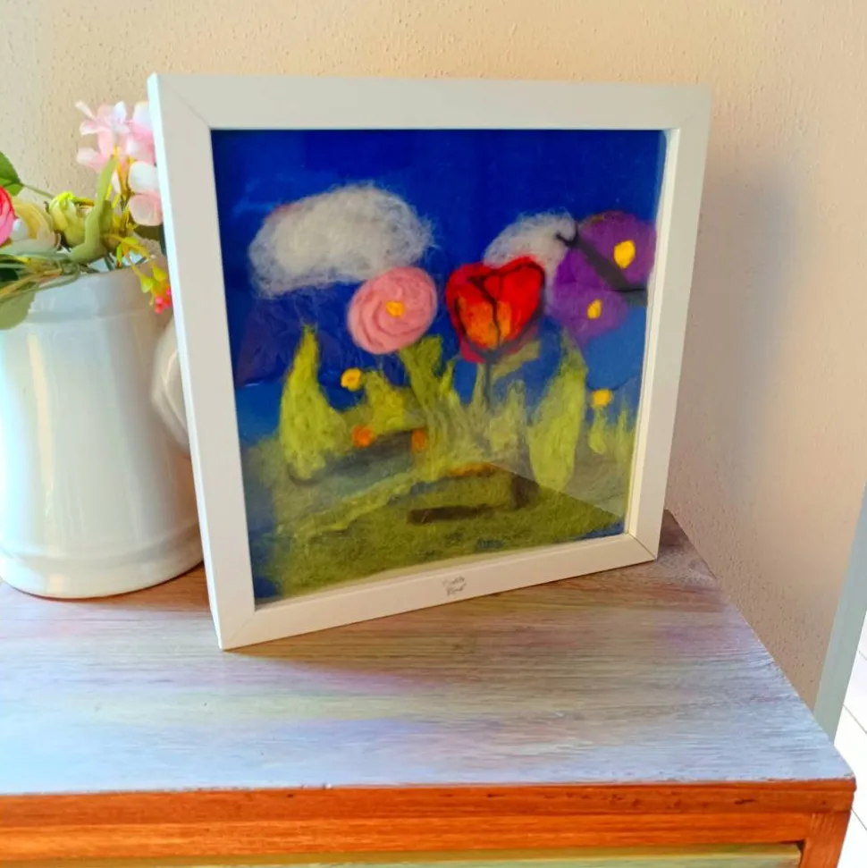 Für jemanden, der sich an der Filzkunst erfreuen kann, habe ich hier eine handgefilzte 3-D- Blumen in eine Filzwiese eingebettet und in den Rahmen eingepasst!