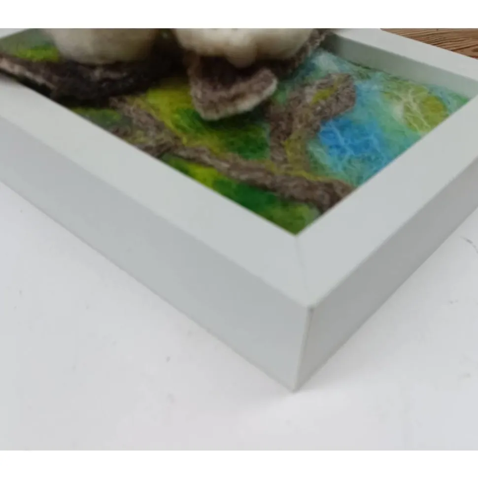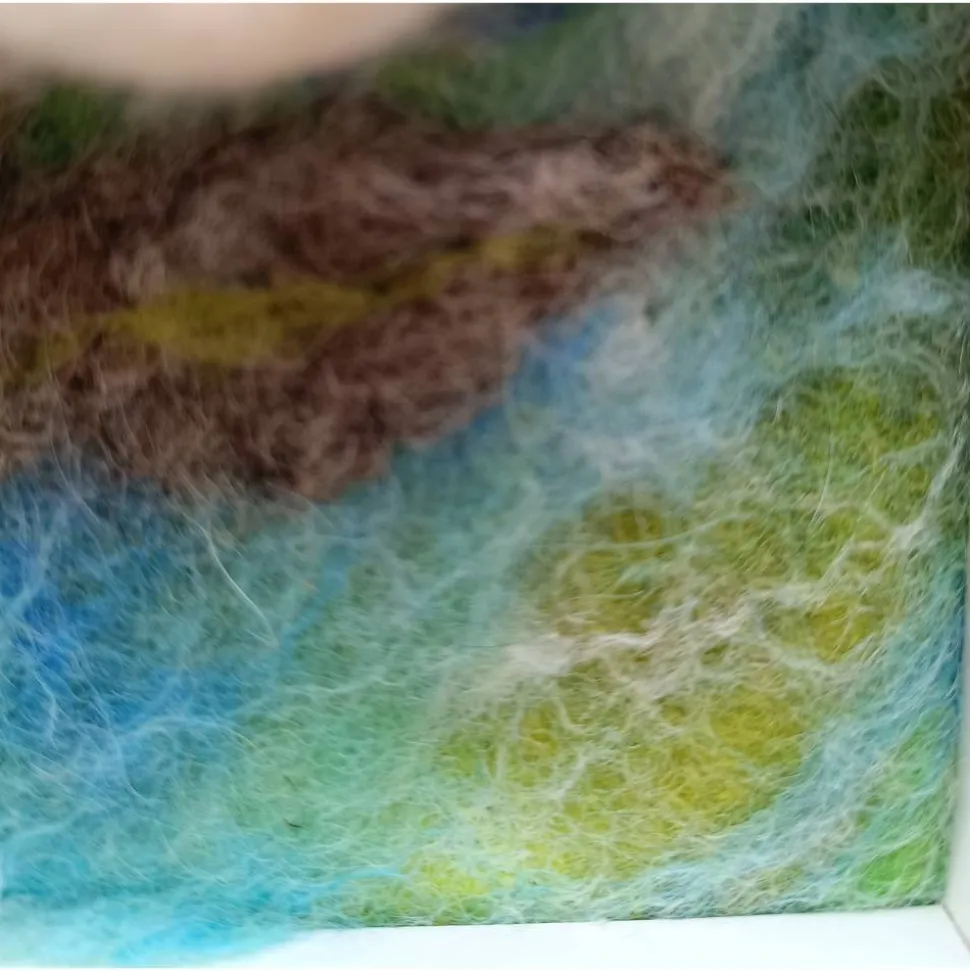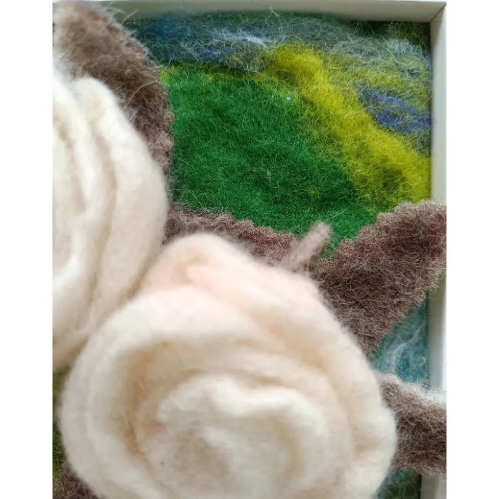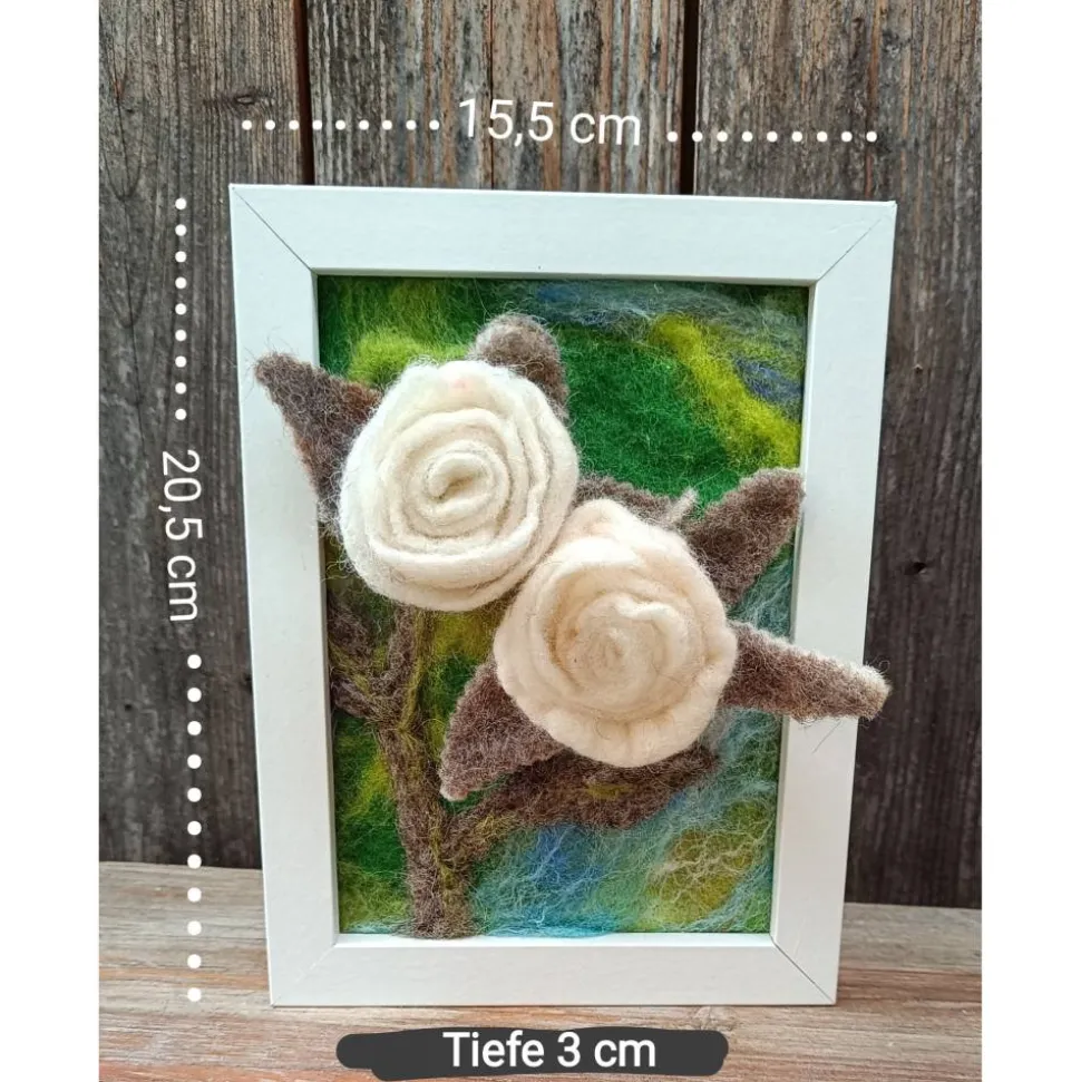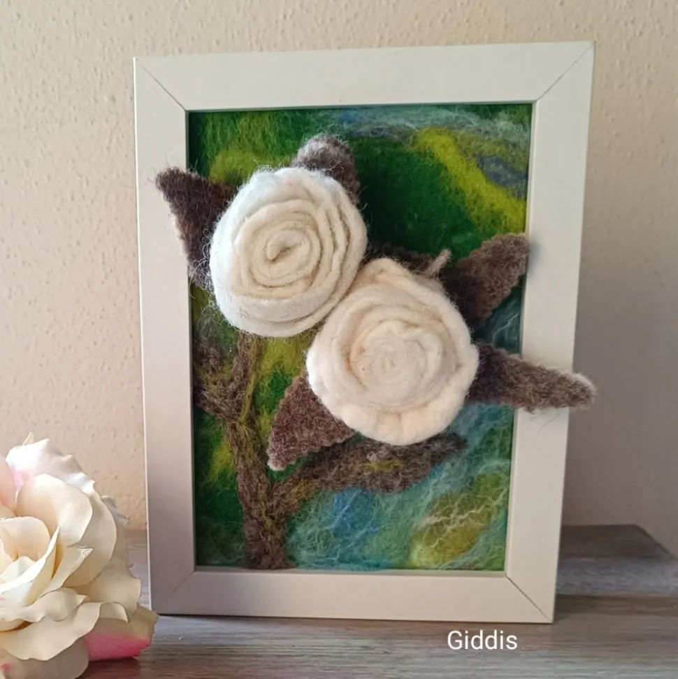Für jemanden, der sich an der Filzkunst erfreuen kann, habe ich hier handgefilzte weiße 3-D-Rosen in eine Filzlandschaft eingebettet und in den Rahmen eingepasst!