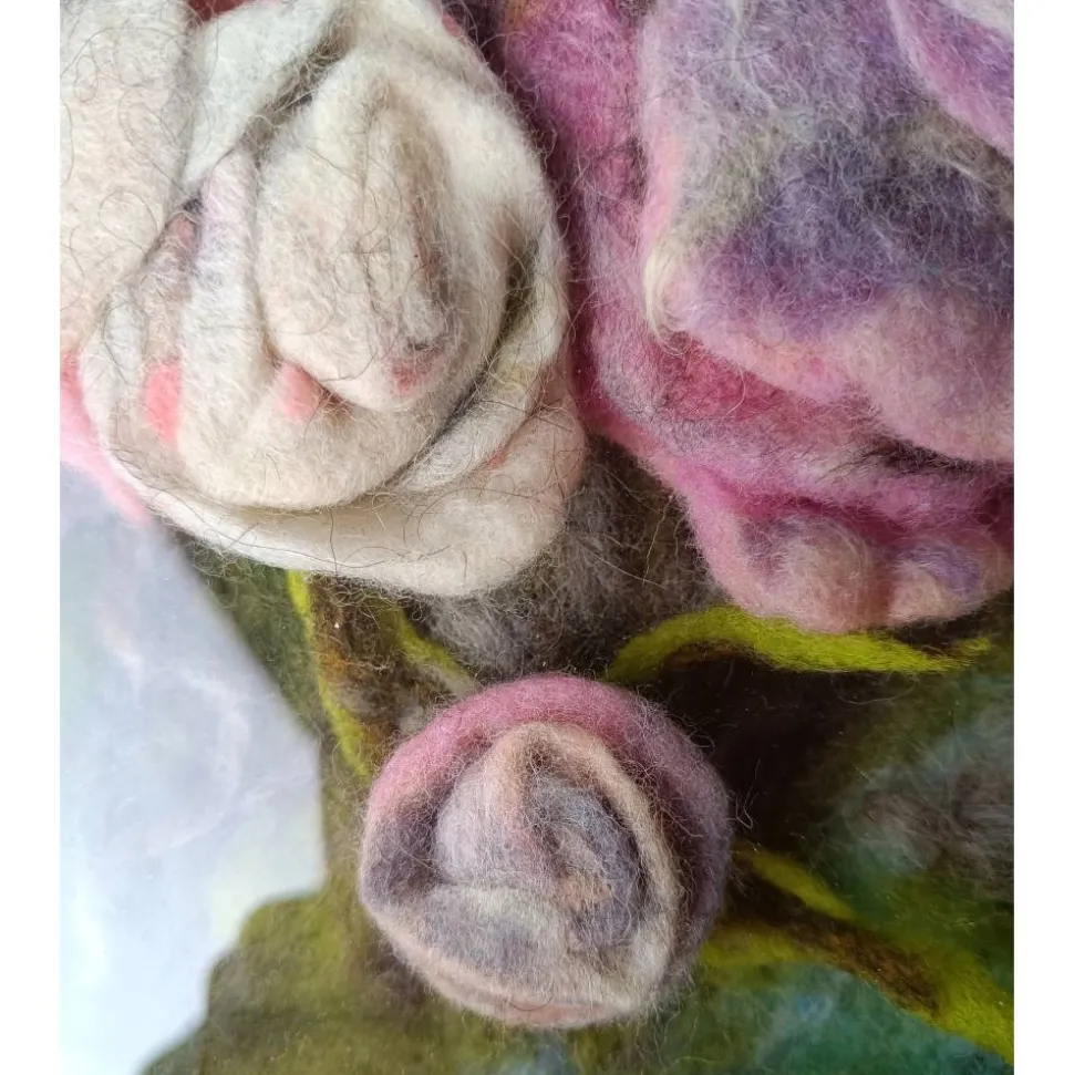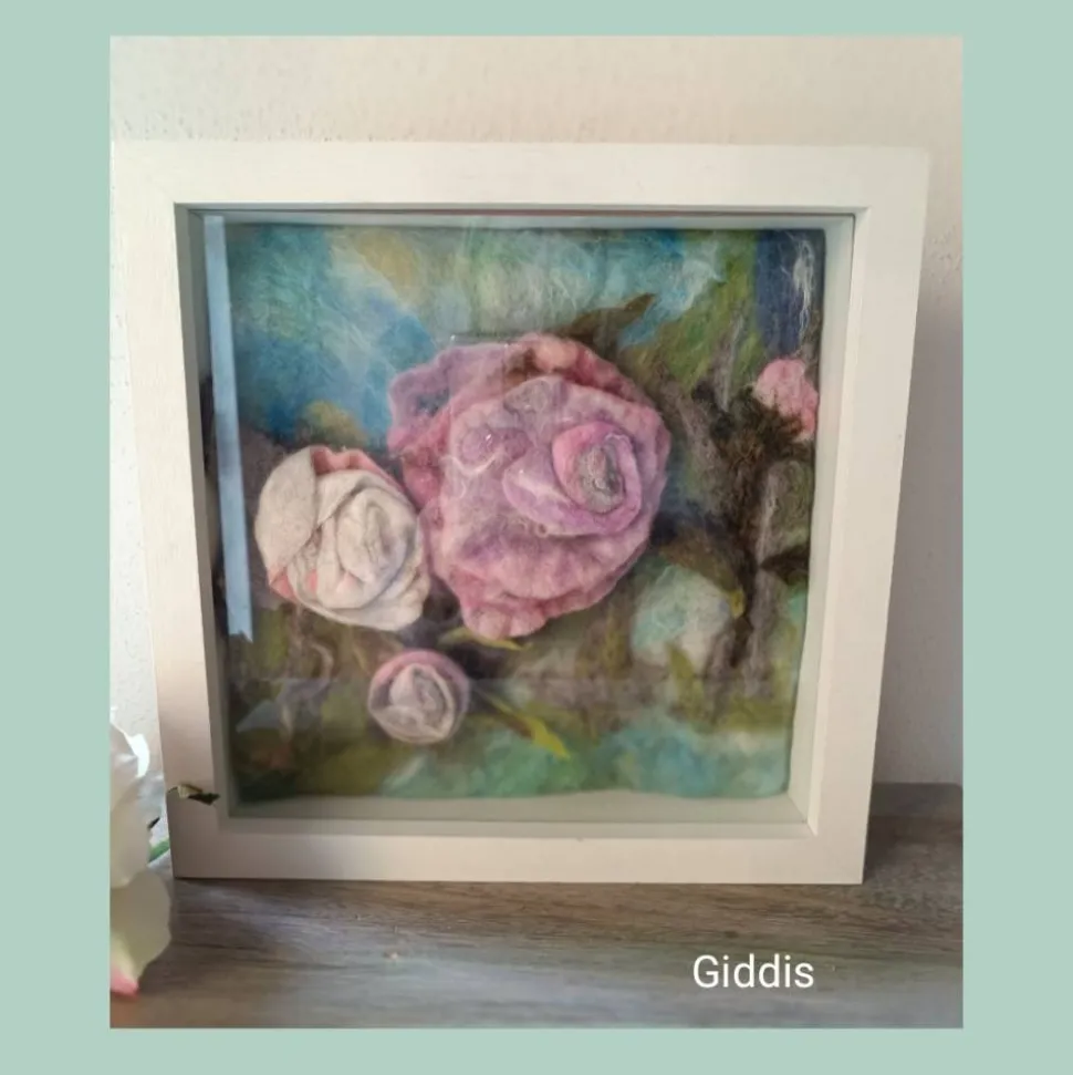 Für jemanden, der sich an der Filzkunst erfreuen kann, habe ich hier handgefilzte 3-D-Rosen in eine Filzlandschaft eingebettet und in den Rahmen eingepasst!