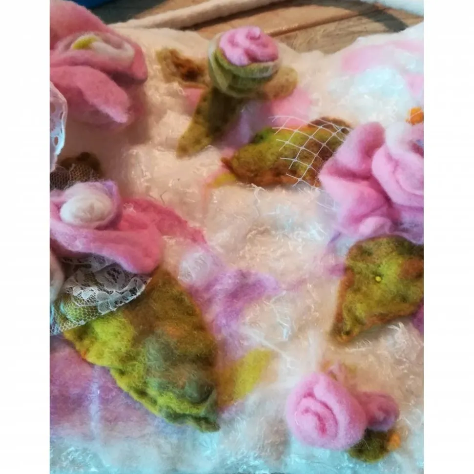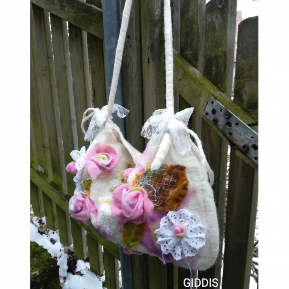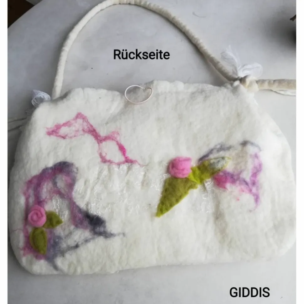 Wunderschöne romantische Umhängetasche aus 100% Wolle/Merinowolle handgefilzt mit angenähren Spitzen und FILZ Rosen, die auch handgefilzt sind! Das Schulterband ist ebenfalls aus einer Filzkordel mit 1,5 cm dicke und 75cm Länge. Mit eingenähtem Innenfutter aus Baumwolle mit Handytasche zum Verschließen. Die Tasche wird mit Gummiband und einer gefilzten Rose, die als Knopf dient, geschlossen! Äußerst chic und romantisch für große und kleine Prinzessinnen und romantische Träumerinnen. Zur Hochzeit oder andere Festlichkeiten genauso geeignet wie im Alltag zur Jeans Ein Hingucker ist diese Tasche allemal!