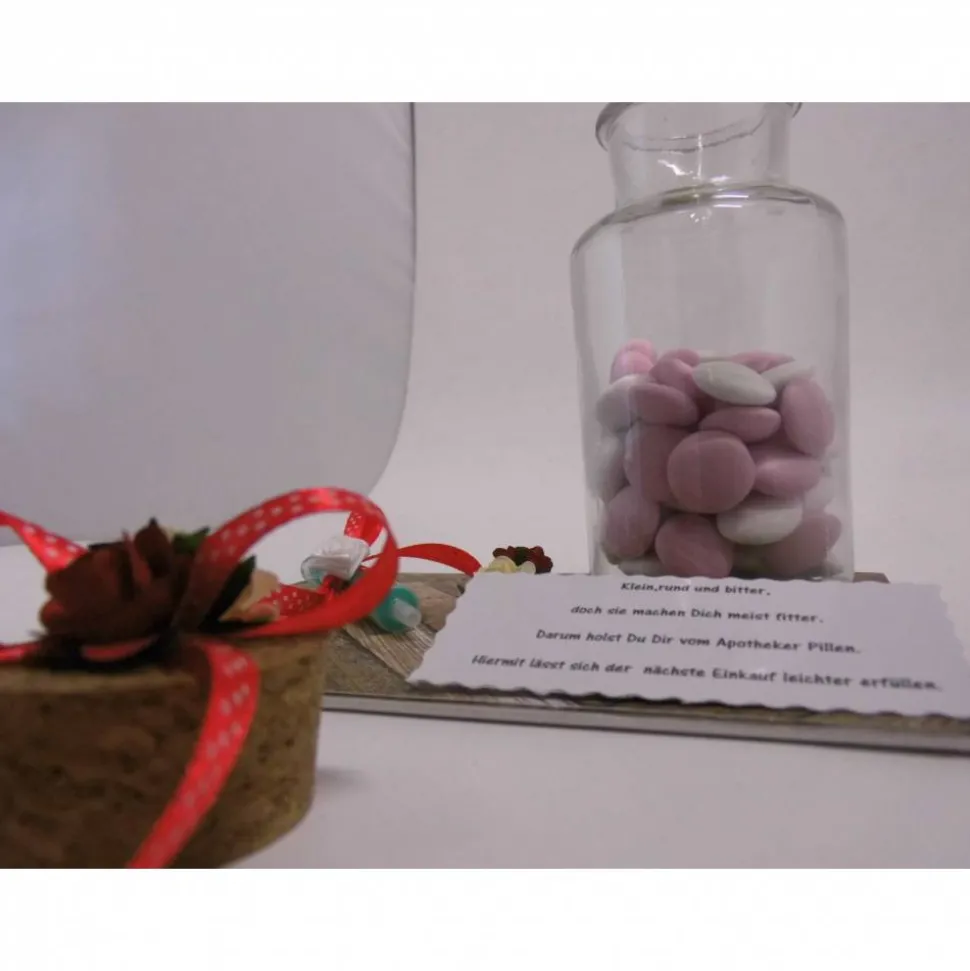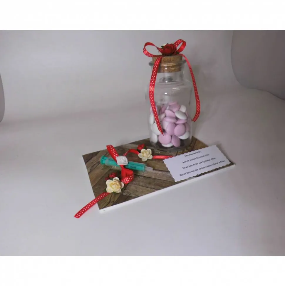 Nach dem Ausgeben des Gutscheins bleibt die liebevoll gestaltete Deko als Erinnerung an den Ehrentag erhalten. Du erhältst einen Malkarton, beklebt mit Parkettmotivpapier, dekoriert mit einer kleinen Plastikspritze. Dazu gibt es ein Glas mit Korkdeckel, das ich persönlich mit etwa 100 Gramm frischen Schokolinsen fülle – eine süße Nervennahrung für turbulente Zeiten. Die Schokolinsen werden immer frisch gekauft, sobald Du den Artikel bestellst.