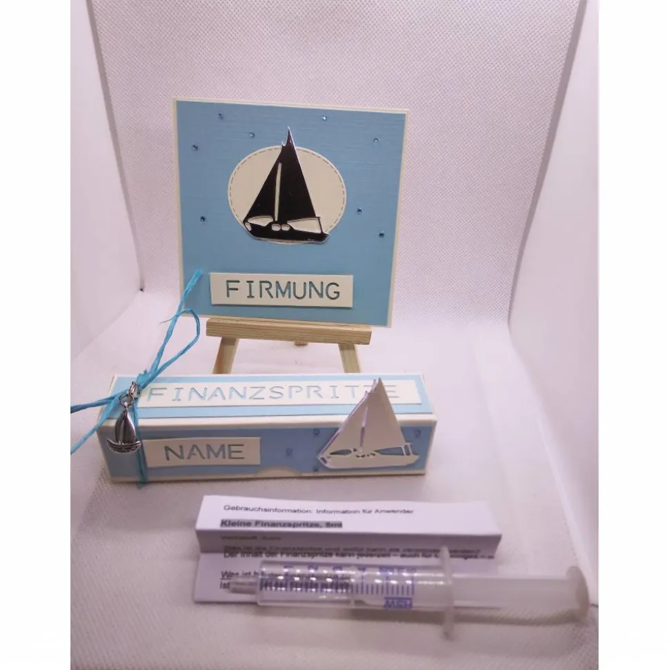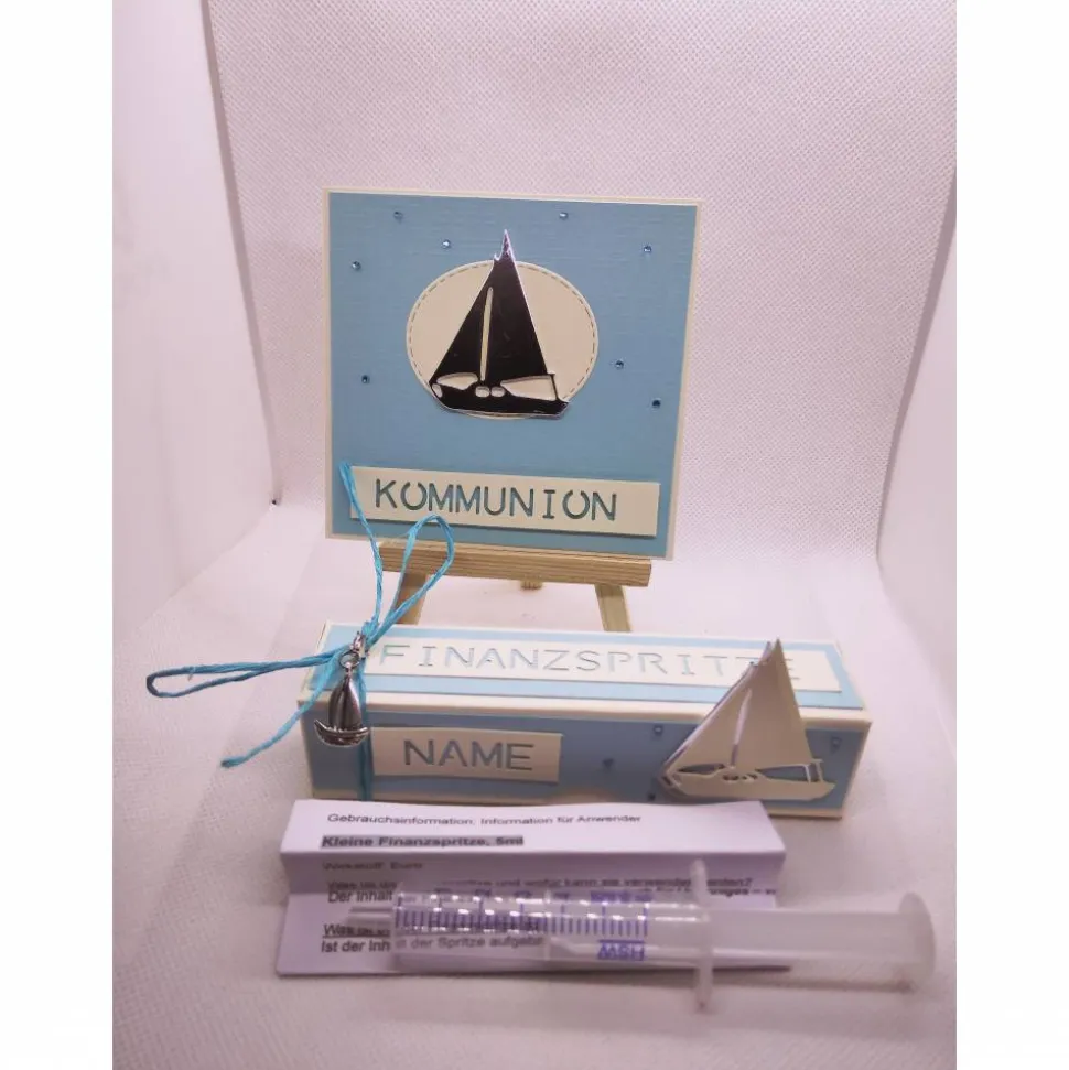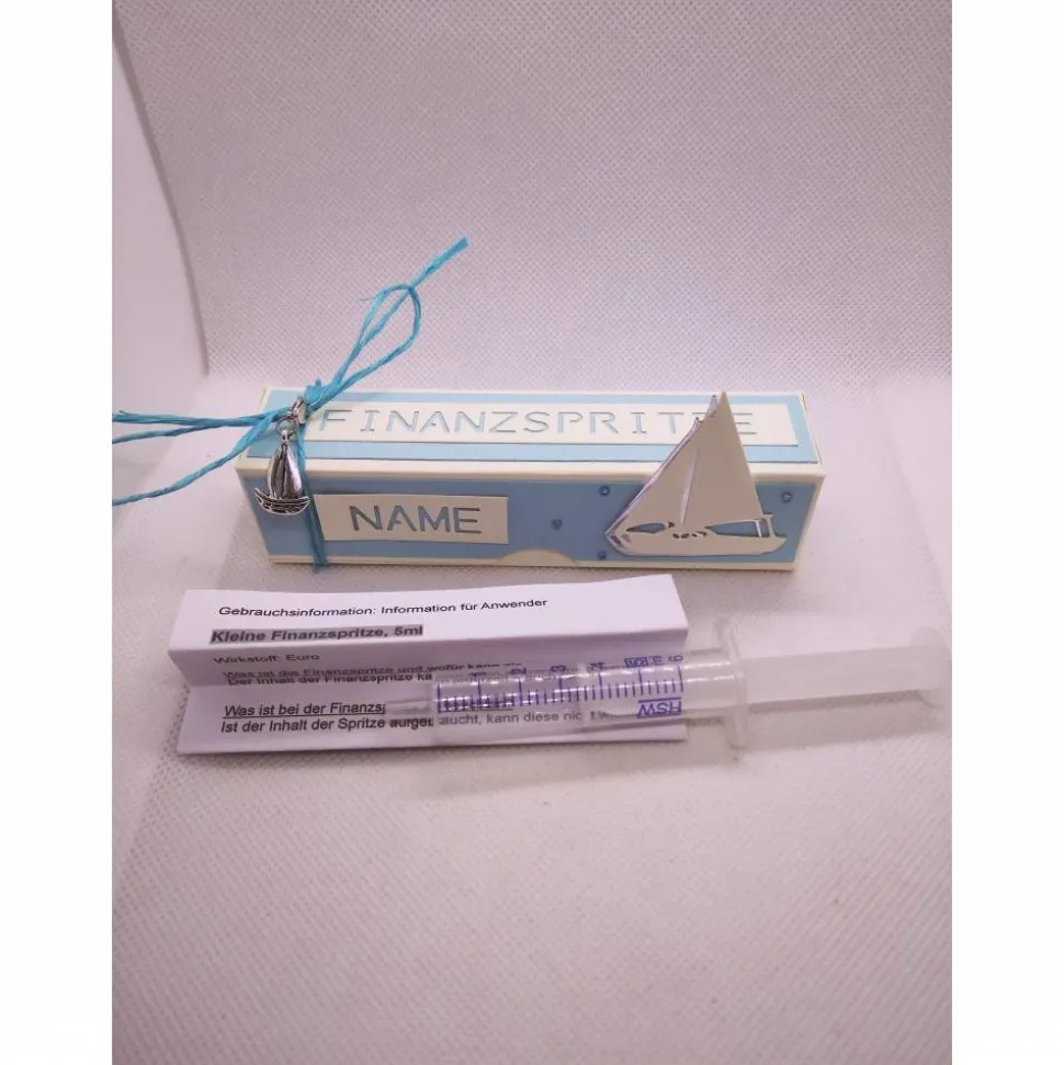Gebastelt habe ich hier aus Leinenkarton eine cremefarbene Box zum aufklappen. Sie ist dekoriert mit hellbauem Leinenkarton. Als Motiv ist eine weißes/silberfarbenes Schiff aufgesetzt. In dieser Box befindet sich eine Packungsbeilage (auf witzige Art geschrieben) sowie eine neue und unbenutzte 6 ml Spritze für den Geldschein.