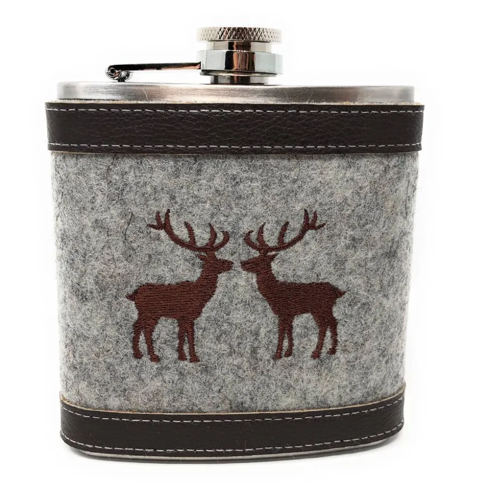 Der hier abgebildete, grau-melierte Wollfilz passt perfekt zum dunkelbraunen Leder und den dunkelbraunen Hirschen. Ergänzt wird der Flachmann durch einen mitgelieferten Trichter, mit dem sich die Flüssigkeit einfacher einfüllen läßt, sowie einer mit schwarzem Satin ausgeschlagenen Geschenkbox.