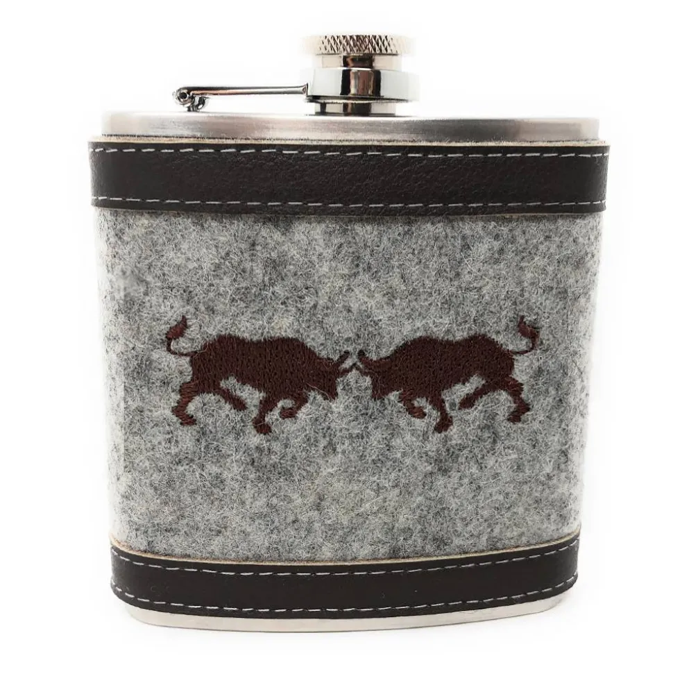 Der hier abgebildete, grau-melierte Wollfilz passt perfekt zum dunkelbraunen Leder und den dunkelbraunen Stieren. Ergänzt wird der Flachmann durch einen mitgelieferten Trichter, mit dem sich die Flüssigkeit einfacher einfüllen läßt, sowie einer mit schwarzem Satin ausgeschlagenen Geschenkbox.