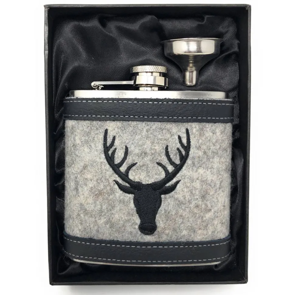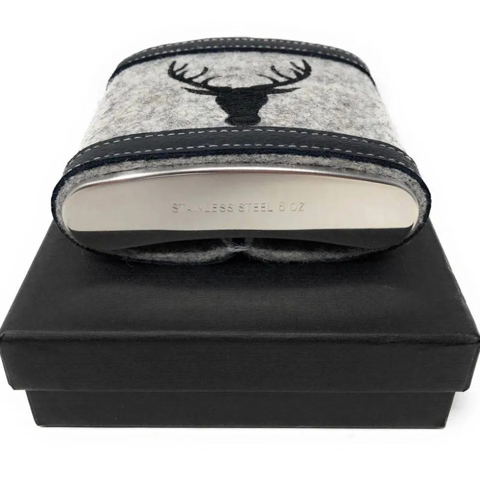 Der hier abgebildete, grau-melierte Wollfilz passt perfekt zum schwarzen Leder und dem schwarzen Hirschkopf. Ergänzt wird der Flachmann durch einen mitgelieferten Trichter, mit dem sich die Flüssigkeit einfacher einfüllen läßt, sowie einer mit schwarzem Satin ausgeschlagenen Geschenkbox.