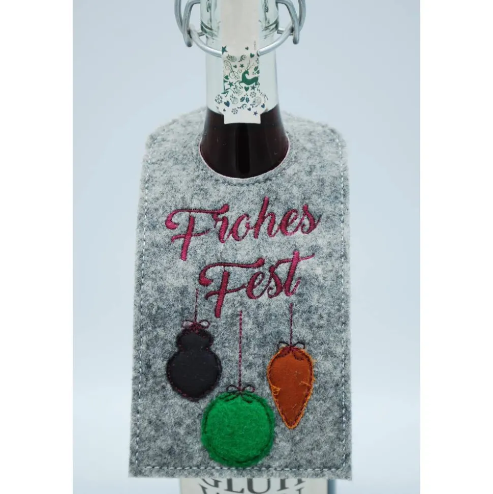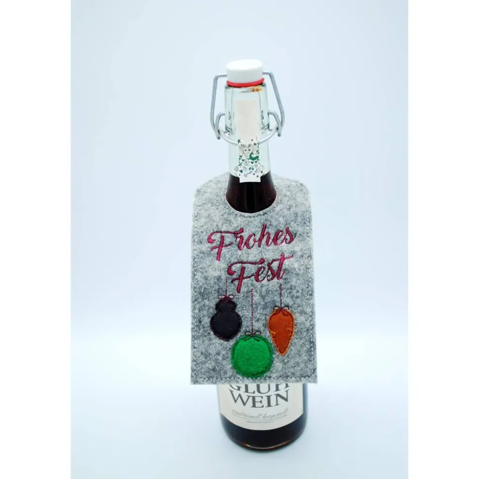 Für gängige Flaschen geeignet, wie man sieht, auch für Bügelhalsflaschen. Die Filzfarbe kann gewählt werden, es ist hellgrau meliert (3 mm), dunkelgrau meliert (3 mm) und beige meliert (2 mm) möglich. Auf Nachfrage wären auch noch folgende Stickfilz-Farben auf Lager: pink-meliert, türkis-meliert, lila meliert. Gerne kann auch etwas anderes aufgestickt werden, dann einfach vorher kurz anfragen und den Spruch bei Personalisierung angeben.