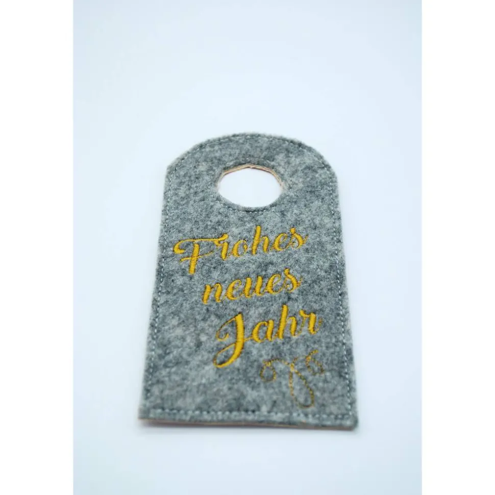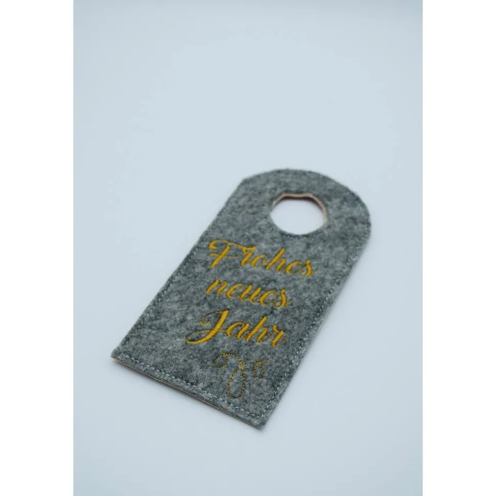 Für gängige Flaschen geeignet, wie man sieht, auch für Bügelhalsflaschen. Die Filzfarbe kann gewählt werden, es ist hellgrau meliert (3 mm), dunkelgrau meliert (3 mm) und beige meliert (2 mm) möglich. Auf Nachfrage wären auch noch folgende Stickfilz-Farben auf Lager: pink-meliert, türkis-meliert, lila meliert. Gerne kann auch etwas anderes aufgestickt werden, dann einfach vorher kurz anfragen und den Spruch bei Personalisierung angeben.