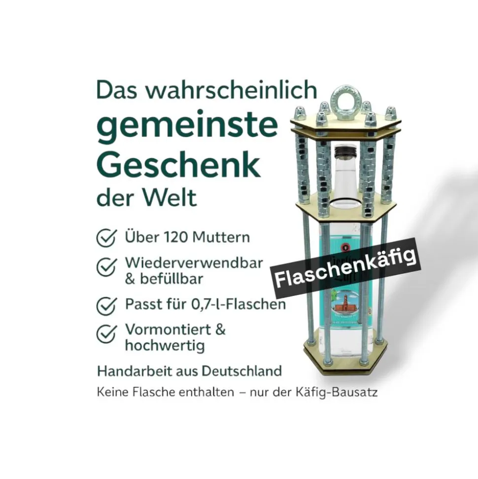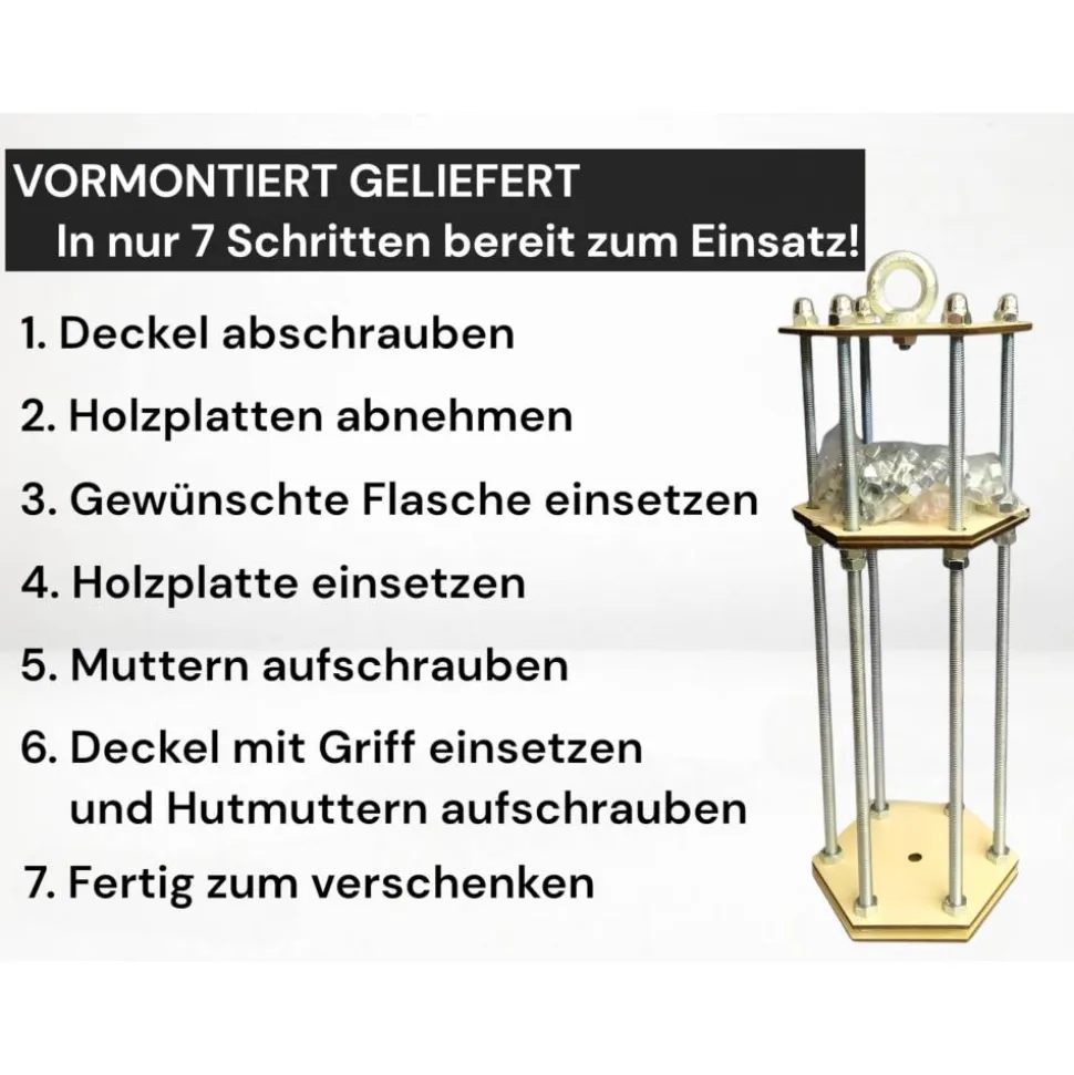 Jeder Flaschenkäfig wird von GET YOUR BOXX UG aus lasergeschnittenen Holzplatten, Gewindestangen und über 120 Muttern gefertigt. Das macht ihn nicht nur zu einem besonderen Männergeschenk, sondern auch besonders langlebig und stabil. Die Montage ist kinderleicht: Der Käfig kommt vormontiert – du setzt nur noch deine Flasche ein und schraubst die Muttern auf. So kannst du den Käfig immer wieder neu befüllen und weiterverschenken.