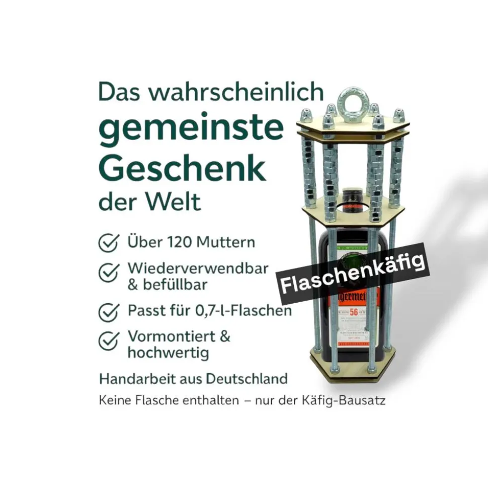 Bestelle jetzt den besonderen Flaschenkäfig für Männer und überrasche Freunde, Kollegen oder Familie mit einer kreativen Geschenkverpackung, die garantiert in Erinnerung bleibt!