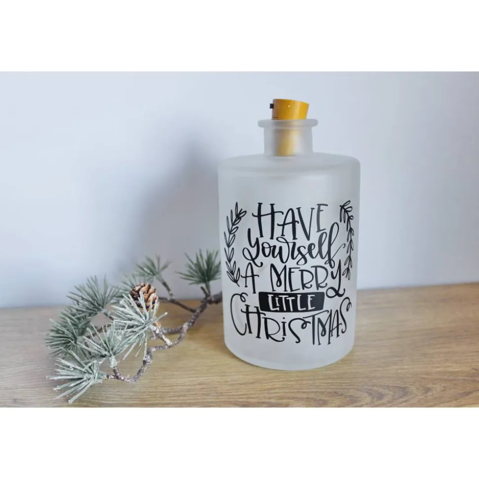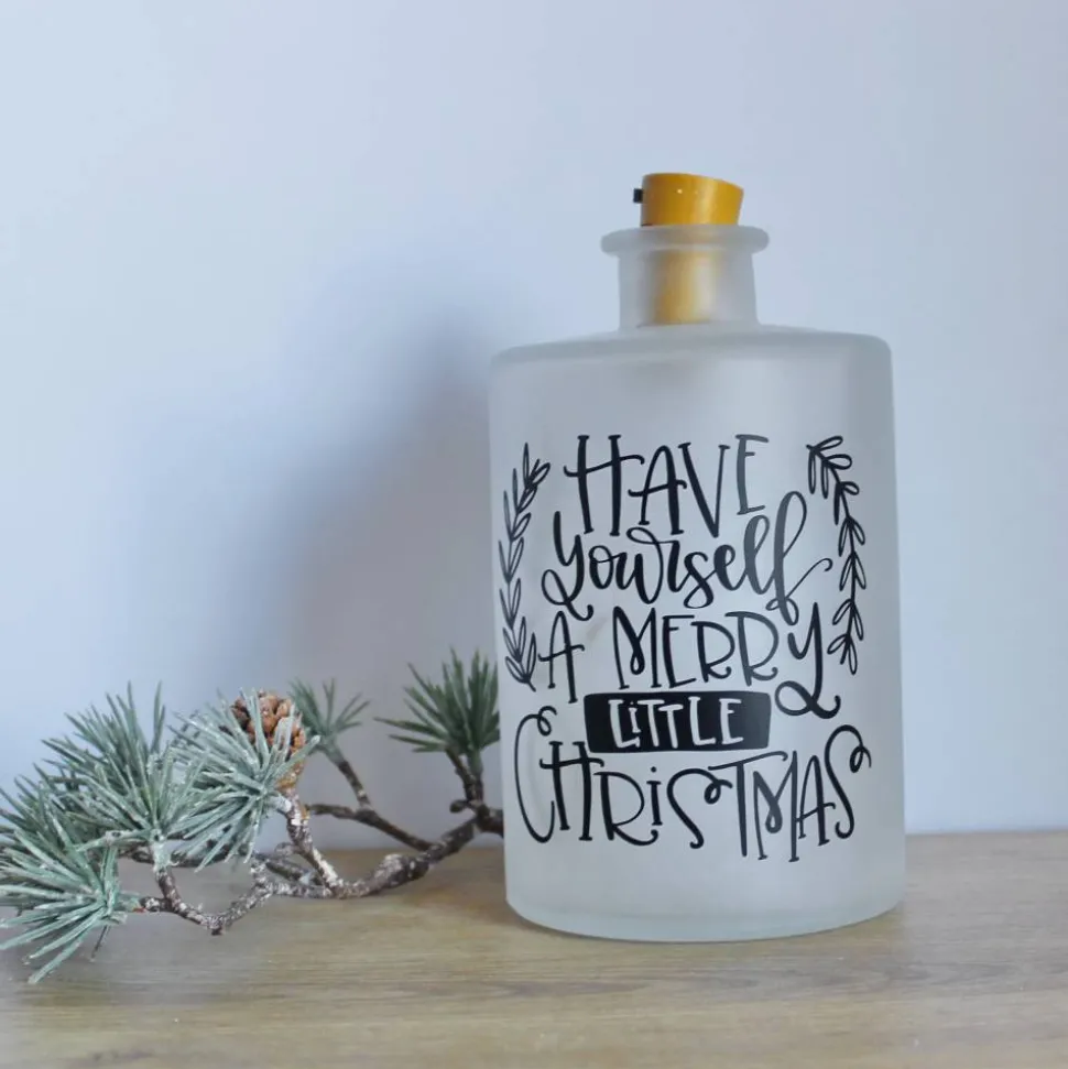 Das Motiv wird aus schwarzer Vinylfolie geschnitten und auf die Flasche aufgebracht.