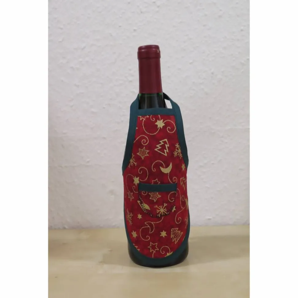 Die Flaschenschürze hat die Masse von H x B 19 x 16, die Bänder seitlich sind 14,5 cm lang.