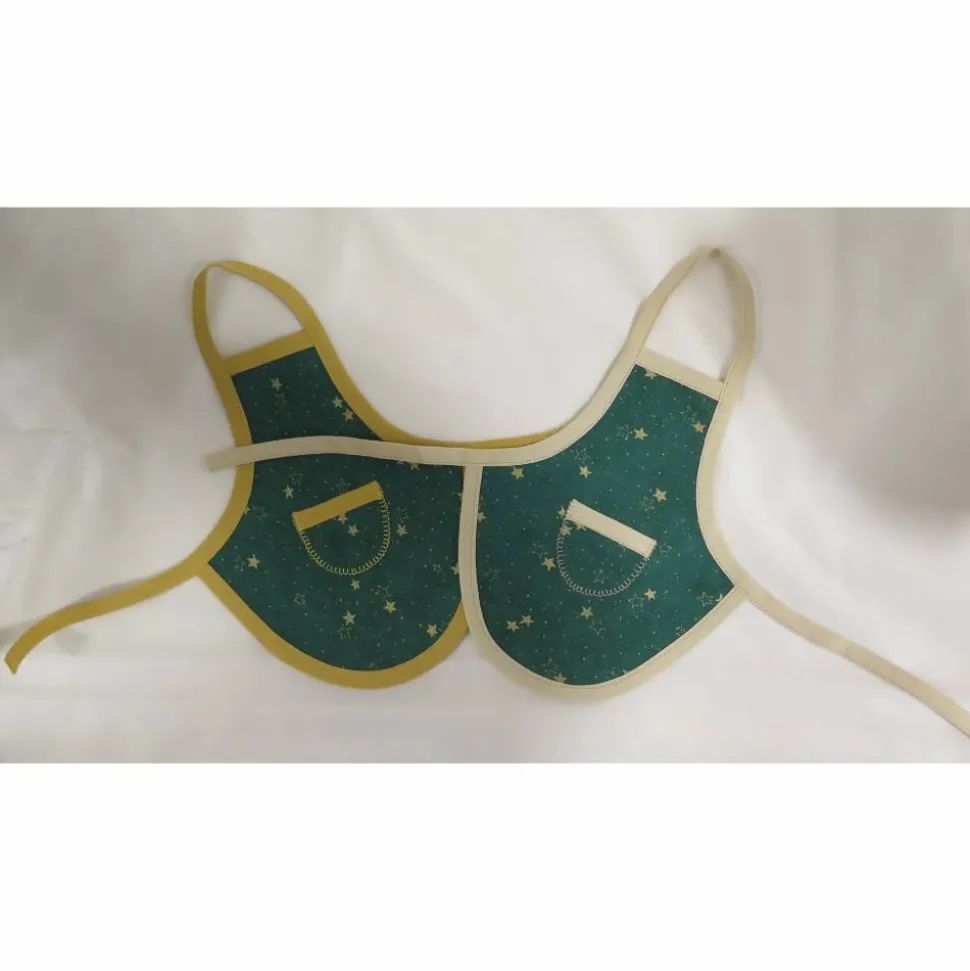 Die Grundfarbe ist grün, bedruckt mit goldenen Sternen, eingefasst entweder mit senfgelben oder beigem Schrägband.