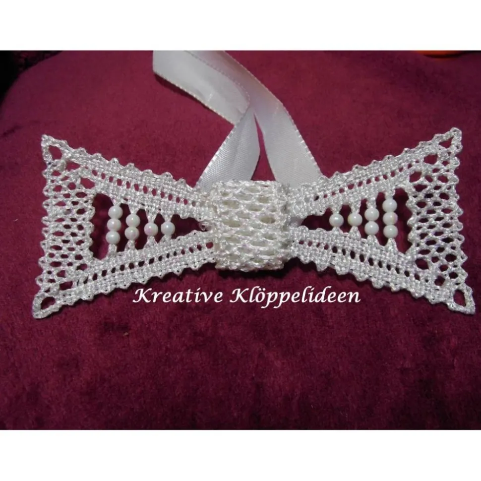 Diese Fliege habe ich mit weißem Viskosegarn, in welches ein metallisierter Polyesterfaden im Farbverlauf von silber, rosé und hellgrün eingewirkt ist, geklöppelt.