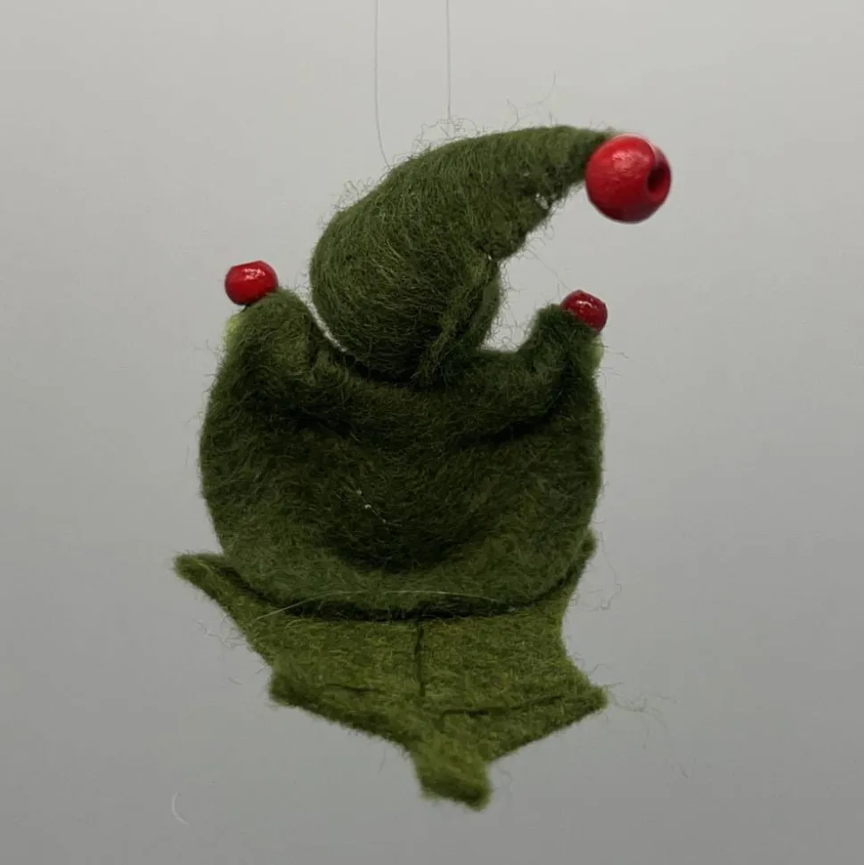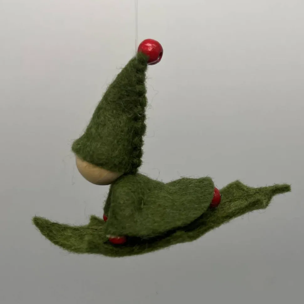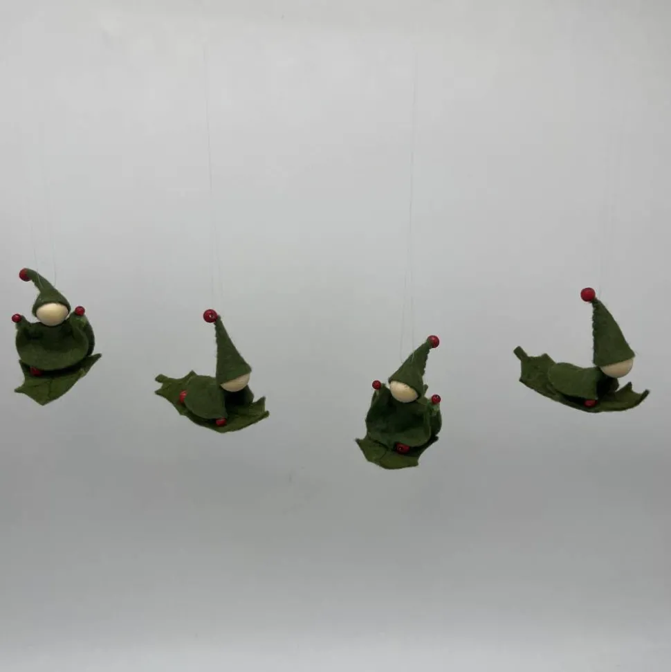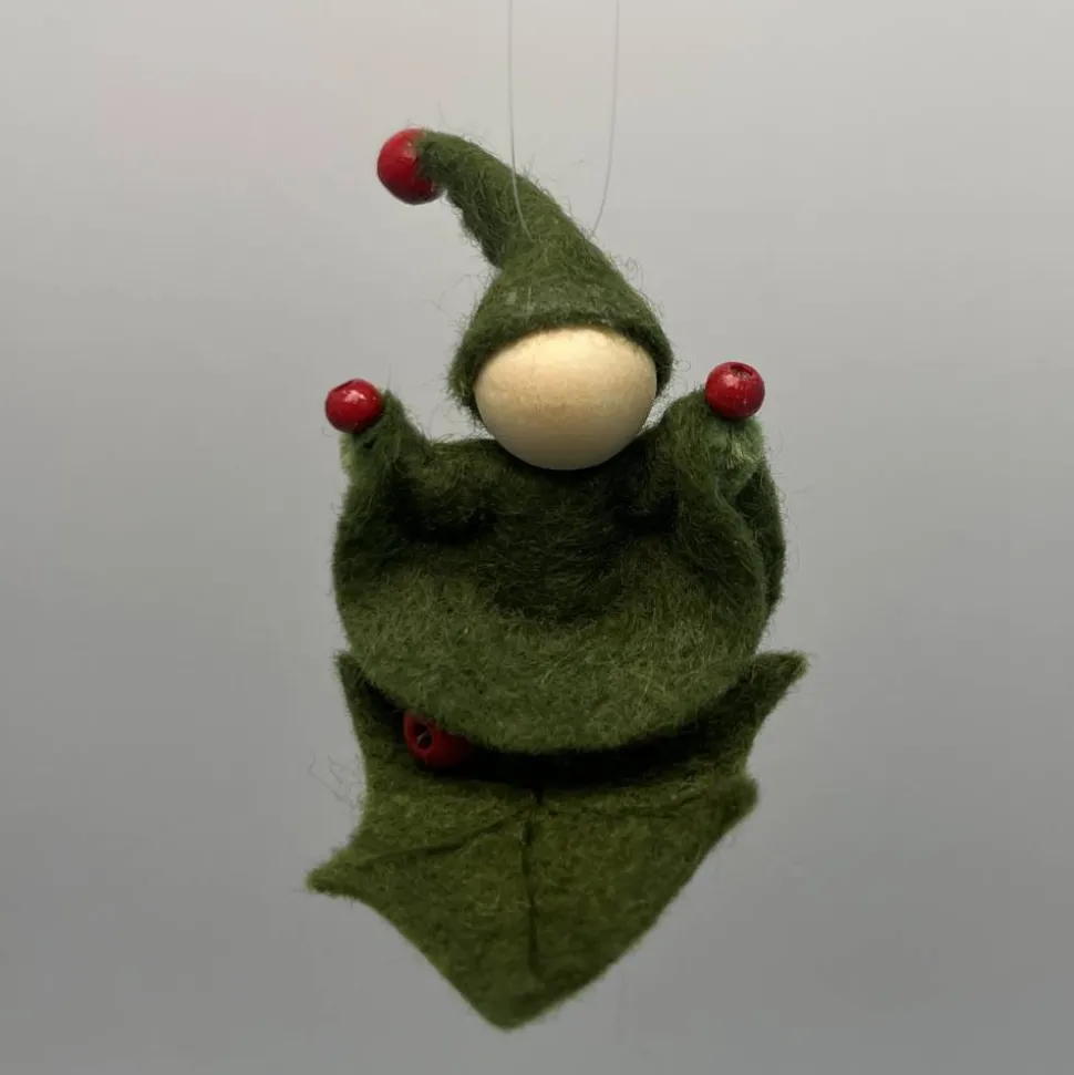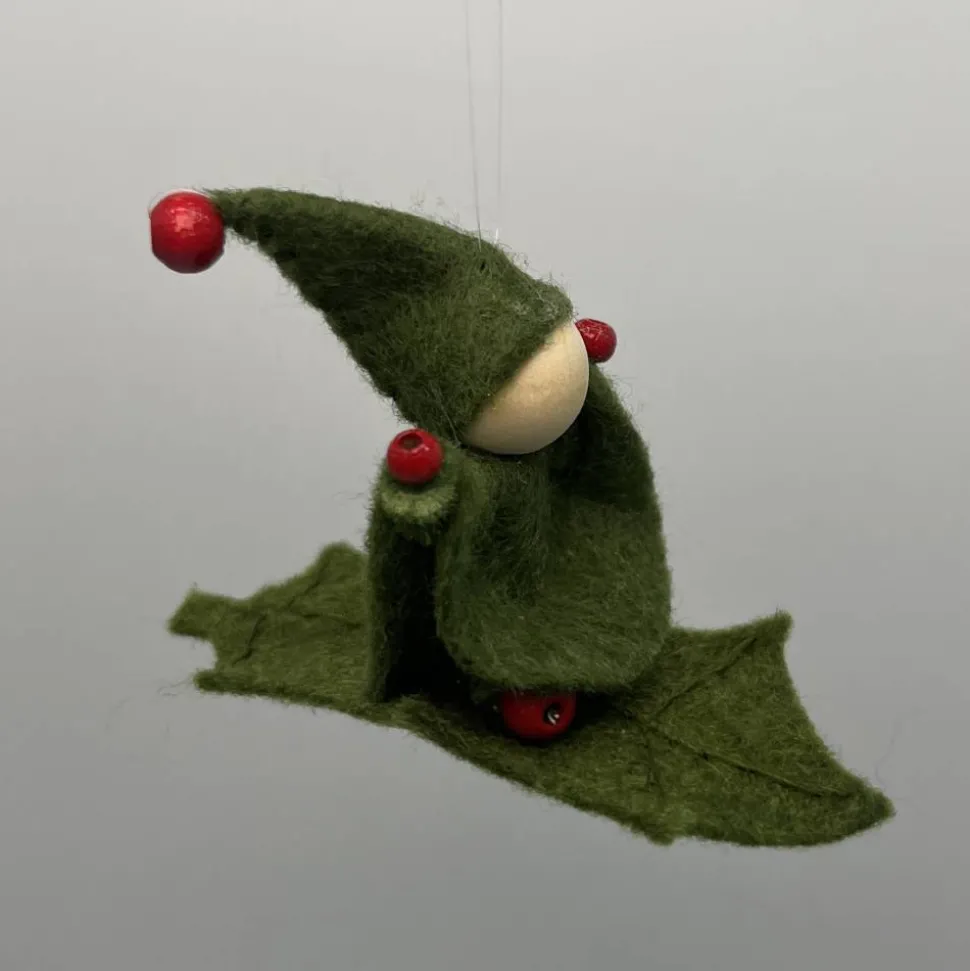 Kopf, Hände und Füße aus bunten Holzperlen, Kleid und Hut sind aus grünem Filz genäht. Das Männchen sitzt oder liegt auf einem Stechpalmenblatt aus Filz. Am Hut ist ein durchsichtiger Nylonfaden befestigt an welchen das Stechpalmenmännchen aufgehängt werden kann.