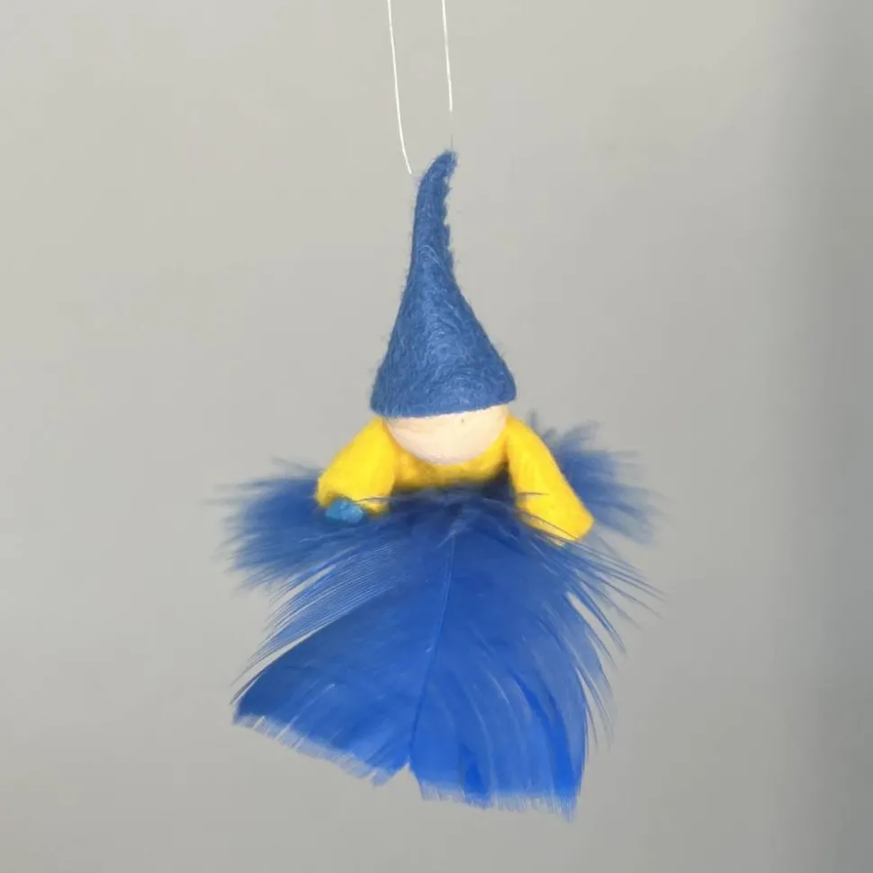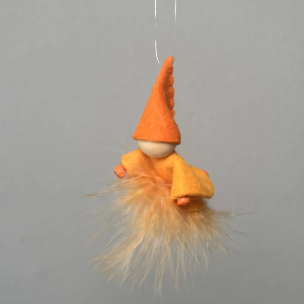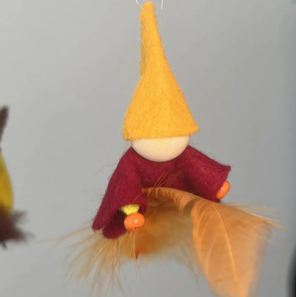 Kopf, Hände und Füße aus bunten Holzperlen, Kleid und Hut sind aus buntem Filz genäht. Das Männchen sitzt oder liegt auf einer bunten Feder. Am Hut ist ein durchsichtiger Nylonfaden befestigt an welchen das bunte Frühlingsmännchen aufgehängt werden kann.