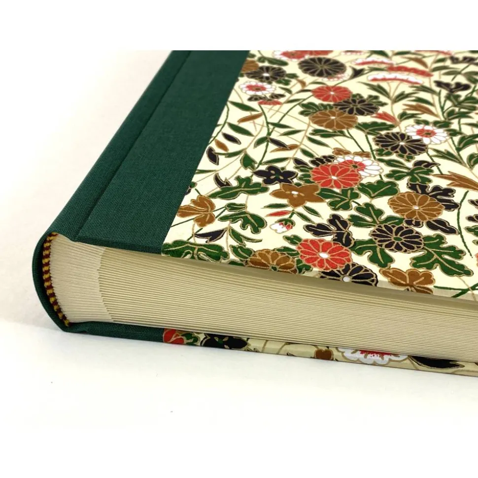 Der Einband ist in einem Buchrücken aus Buchbinderleinen gefasst und mit Chiyogami überzogen.