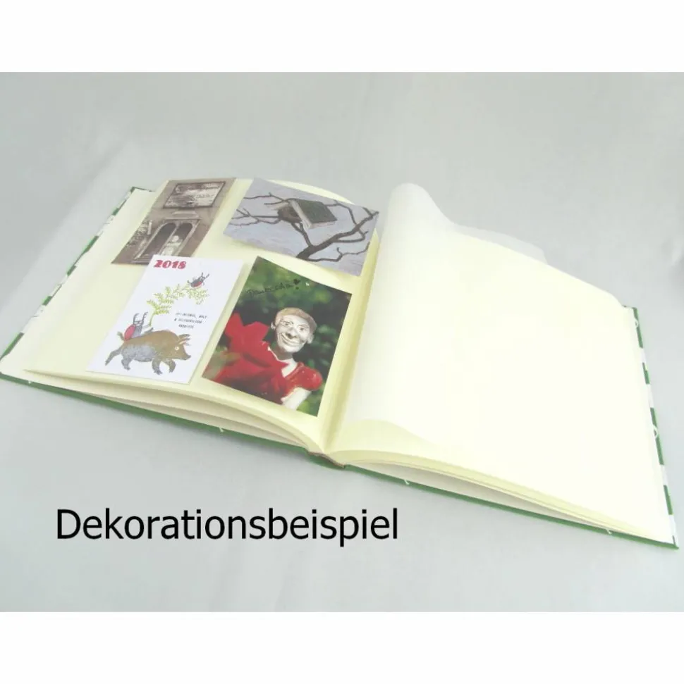 Die 31 Blätter / 62 Seiten aus stabilem Fotokarton in cremeweiß lassen Schnappschüsse und Erinnerungsfotos gut zur Geltung kommen. Zwischen den Blättern ist jeweils Pergaminpapier.