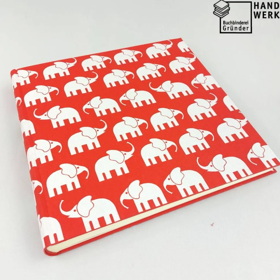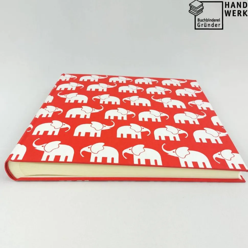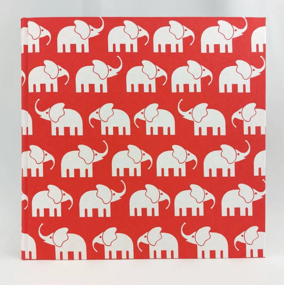 Dieses Fotoalbum ist in hellroten Baumwollstoff fest eingebunden. Über das Album wandert eine kleine weiße Elefantenherde.