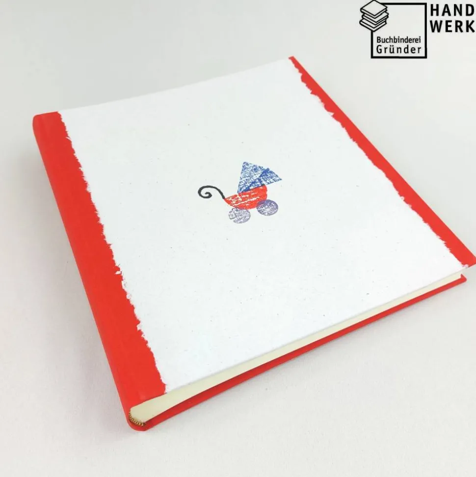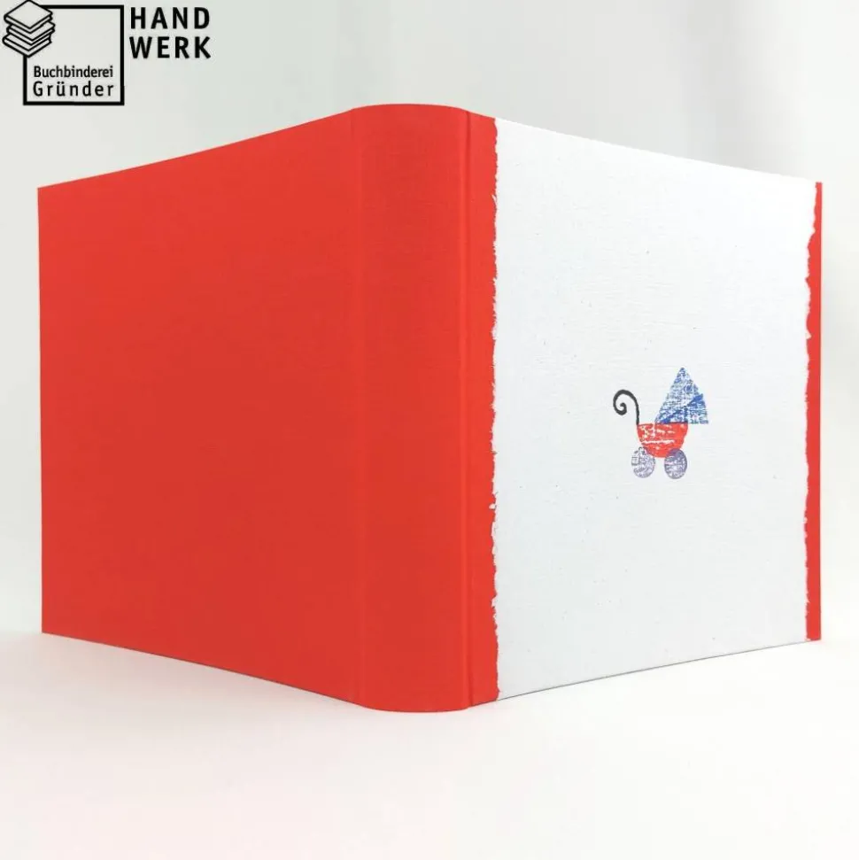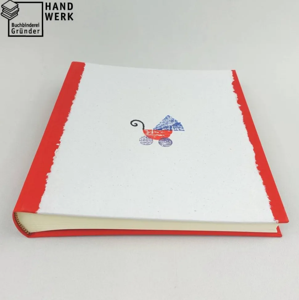 Die Vorderseite vom Fotoalbum ist mit handgeschöpftem Papier verziert. Das Papier stammt aus der Werkstatt von paperuli aus Münster. Auf das handgefertigte Papier mit Büttenrand hat paperuli einen Kinderwagen gestempelt.