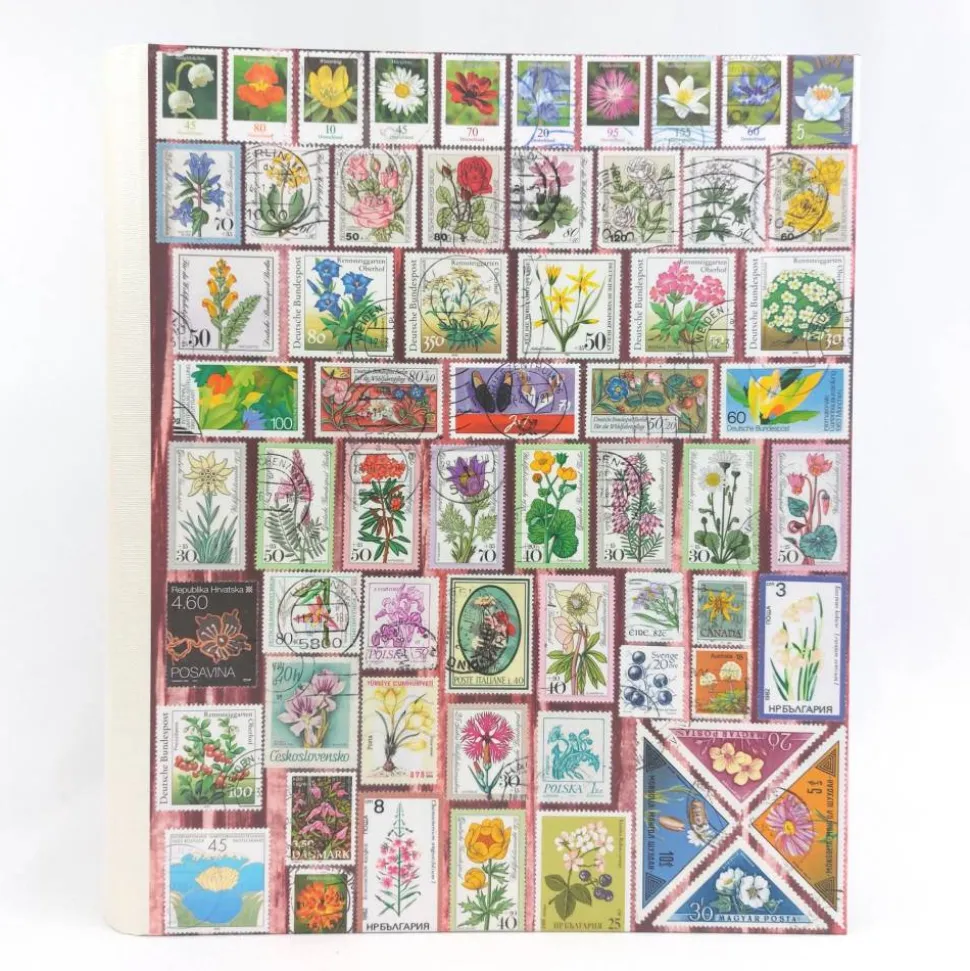 Es war auch eine Briefmarke mit dem Schriftzug “Ja!“ dabei. So wurde sie zum Ideengeber für das Hochzeitsfotoalbum. Sie befindet sich auf der Vorderseite, umgeben von vielen Briefmarken mit Blüten- und Blumenmotiven. Die Briefmarken stammen aus verschiedensten Ländern und sind teilweise schon viele Jahrzehnte alt. Damit das Fotoalbum auch alltagstauglich ist und die Briefmarken geschützt sind, ist die Vorderseite mit einer matten Klebefolie als Griffschutz bezogen. Das fühlt sich samtig an und fällt nicht auf.
