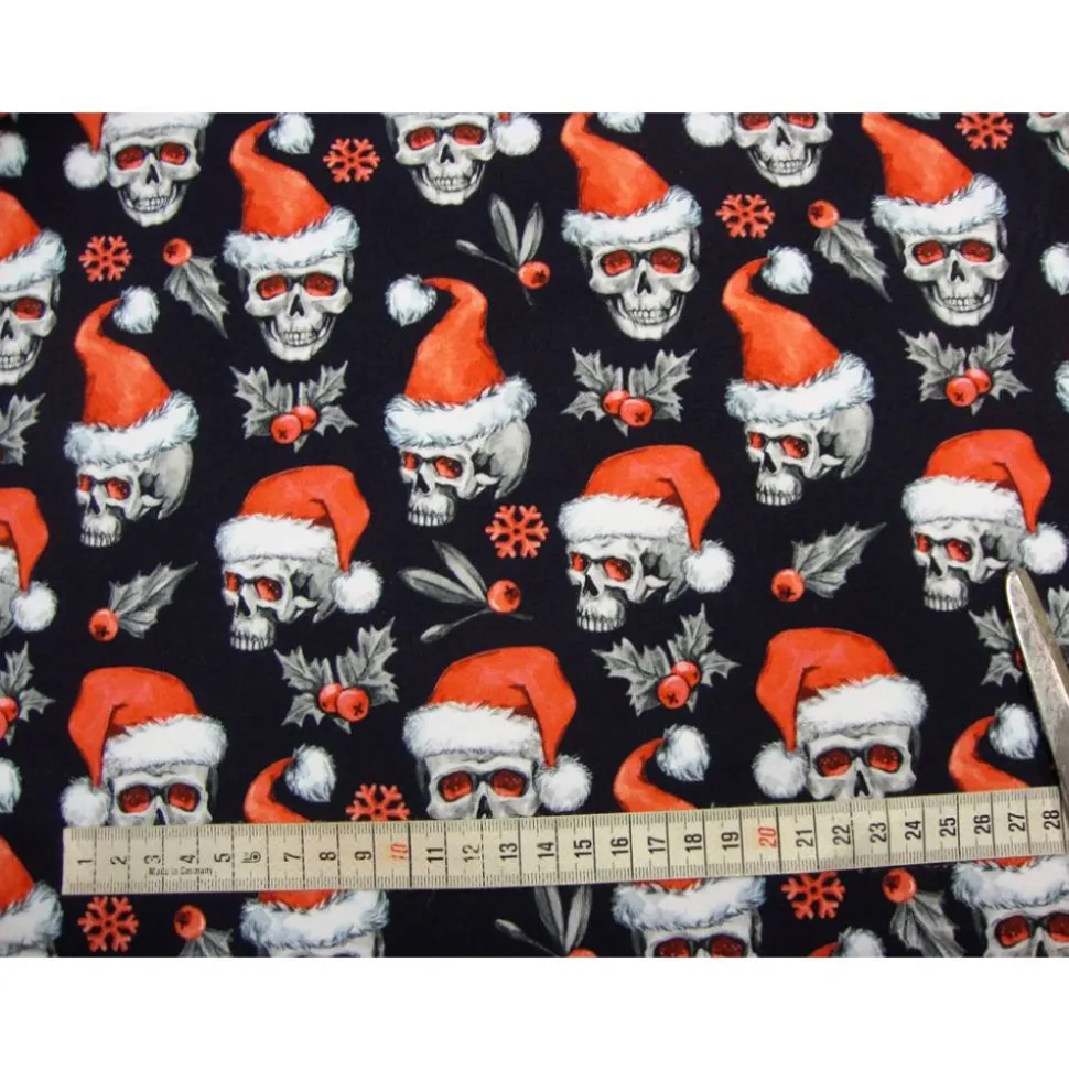Entdecke den einzigartigen French Terry Sweat Totenkopf mit Nikolausmütze! Dieser festliche Stoff mit auffälligen Skulls und Weihnachtstotenköpfen in Rot, Weiß und Schwarz ist ein echtes Highlight für deine Nähprojekte.