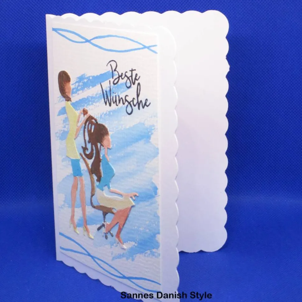 Die Karte ist liebevoll mit Alkoholmarkern koloriert und mit farblich abgestimmten Motivpapieren gestaltet – ein echter Hingucker mit Friseursalon-Flair durch Boden, Wand und Ablage. Friseurin und Kundin sind ausgestanzt und individuell eingefärbt. Jede Karte ist somit ein Unikat und eignet sich auch hervorragend als Geschenk für Friseurinnen.