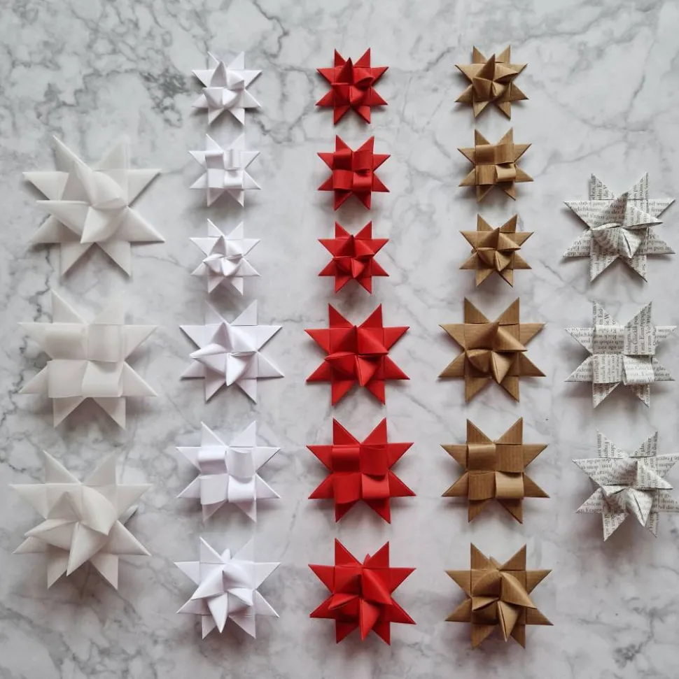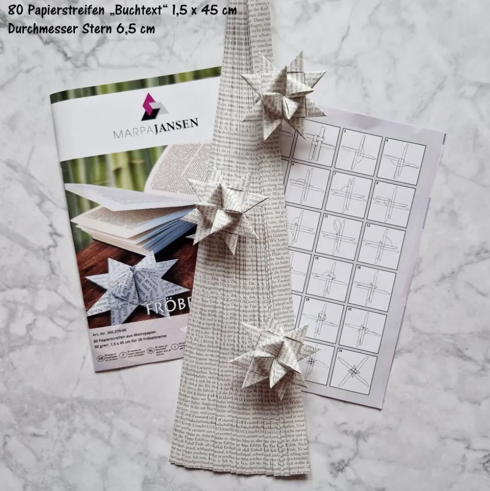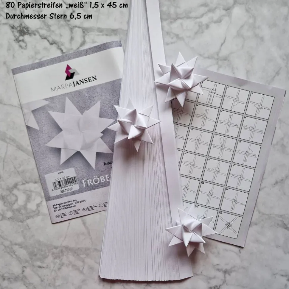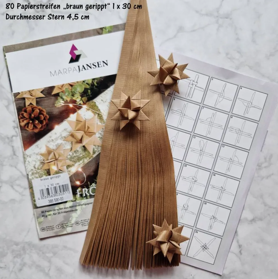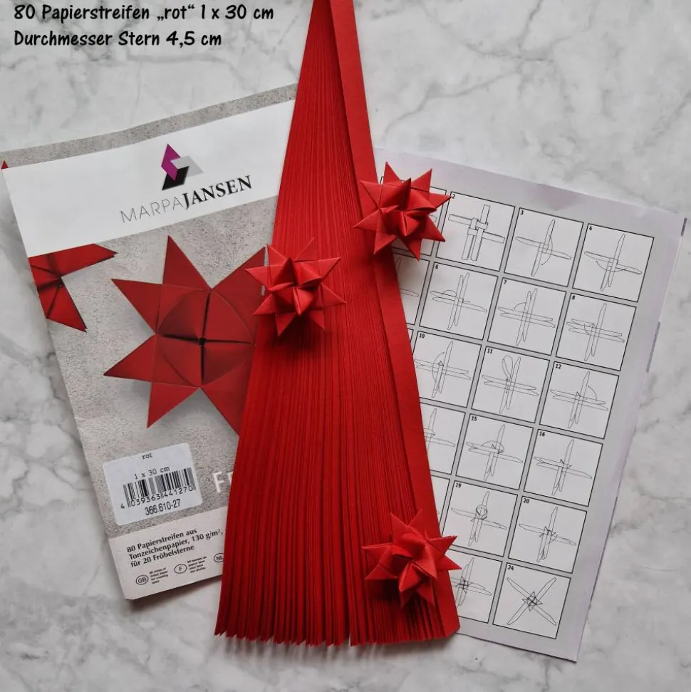 Die Papierstreifen-Sets zur Herstellung von Fröbelsternen, der Firma Marpa Jansen, sind in fünf Farbvarianten und in drei Größen erhältlich.
