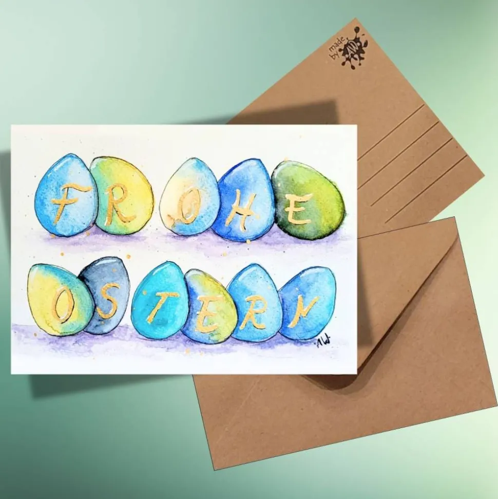Die bunten Eier formen den Schriftzug „Frohe Ostern“ und sorgen für eine verspielte, festliche Osterstimmung. Ob für deine Liebsten oder als kleine Aufmerksamkeit – mit dieser Karte schenkst du ein Stück handgemalte Kunst.