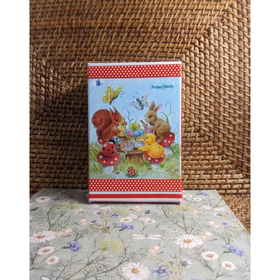 schön verziert mit österlichen Serviettenmotiven. Klebeband vervollständigt das Dekor.