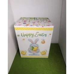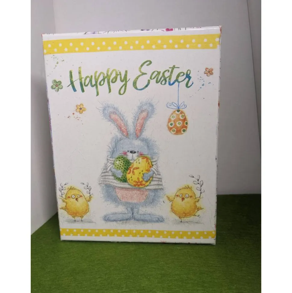 schön verziert mit österlichen Serviettenmotiven. Klebeband vervollständigt das Dekor.