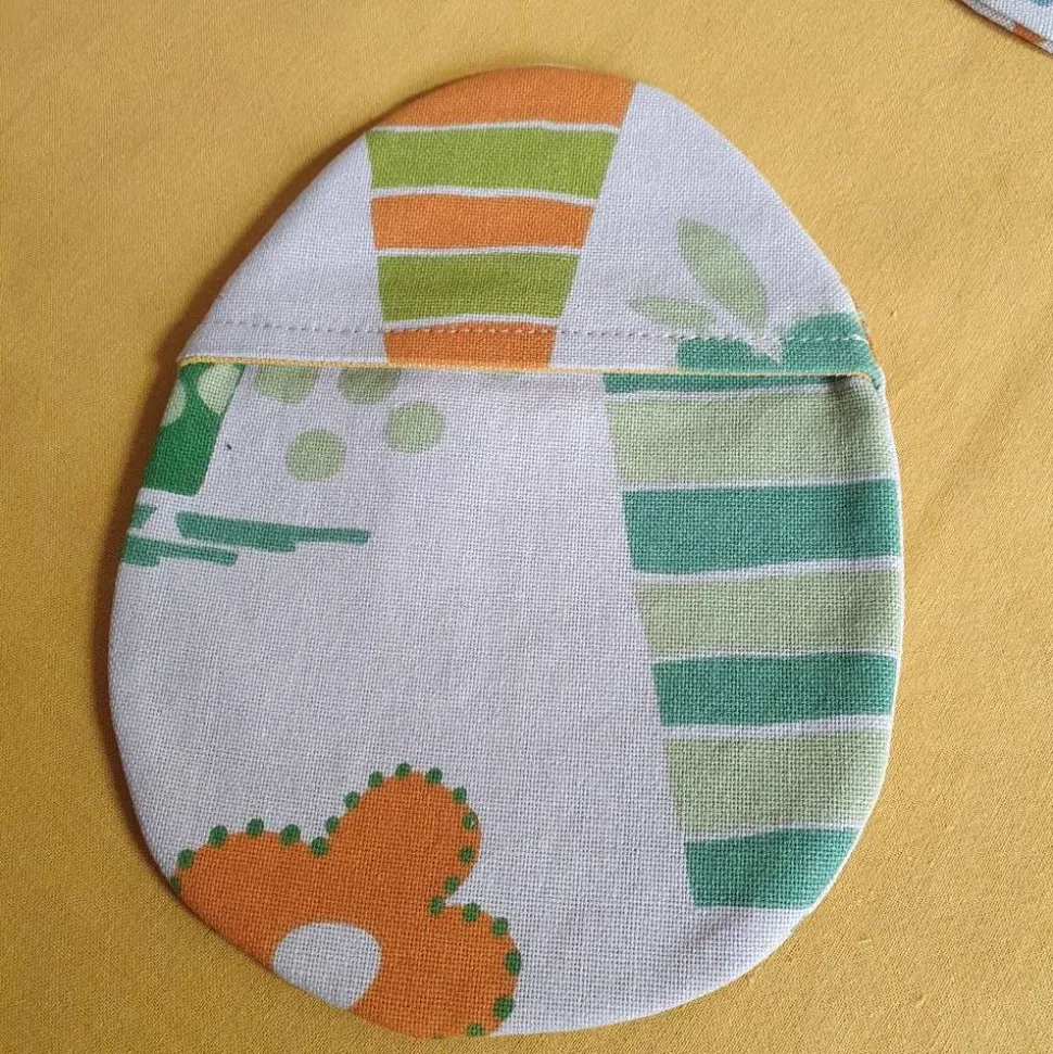 Verwende diese frühlingshafte, gelb gefütterte Stofftasche in Eierform als Mitbringsel, Tischdeko und als charmante Geschenkverpackung für kleine Überraschungen – von Schokoeiern über Osterhasen bis hin zu Geldgeschenken.