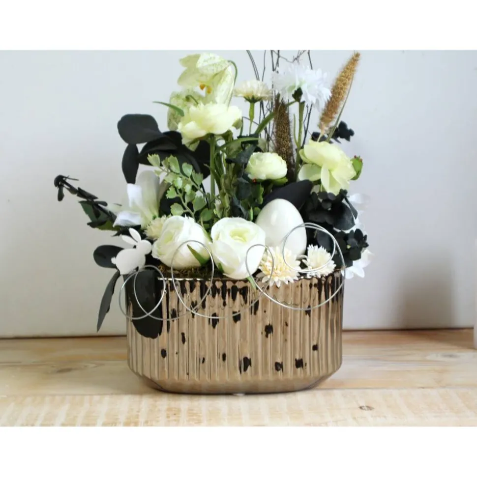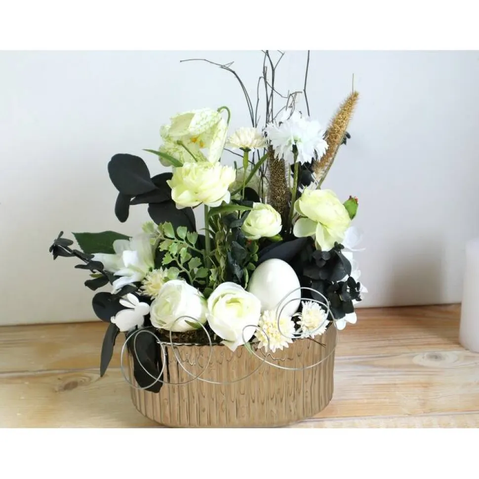 In die schicke Keramikschale wurden künstliche Blüten und Grün eingearbeitet.