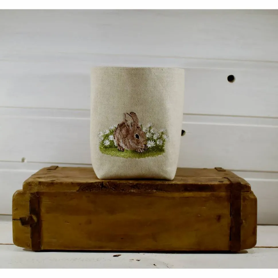 beigefarbenes Utensilo mit einer aufwändigen detailreichen Hasen- / Wiesenstickerei,