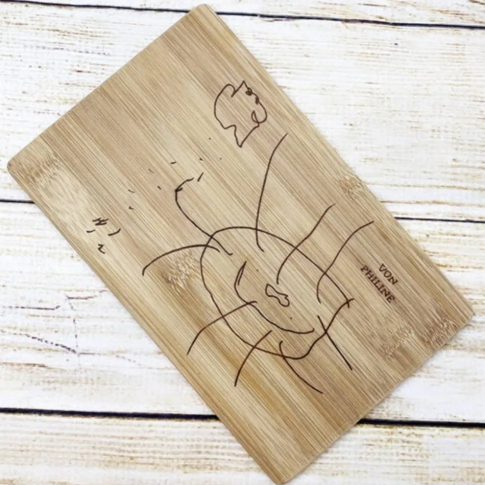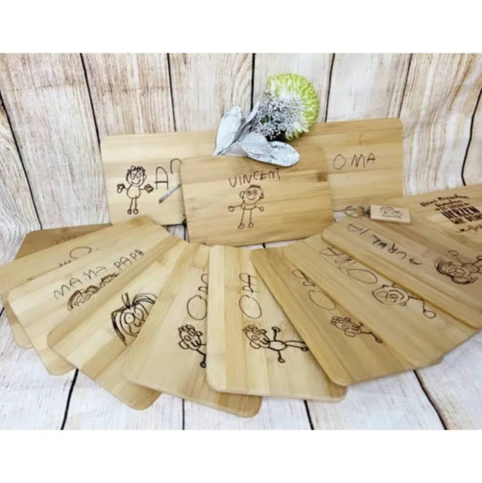 Nach Bestellung schickst du mir ein gezeichnetes Bild von deinem Kind, welches ich dann auf das Frühstücksbrett graviere.