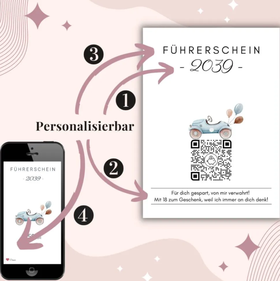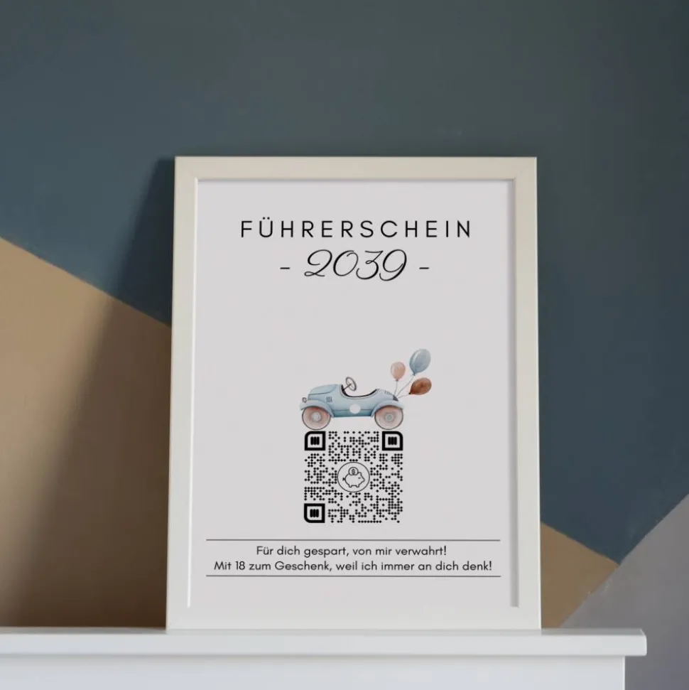 Führerschein Zuschuss | Geldgeschenk | Personalisiertes Virtuelles Sparbuch | QrCode Bild | Auto Blau