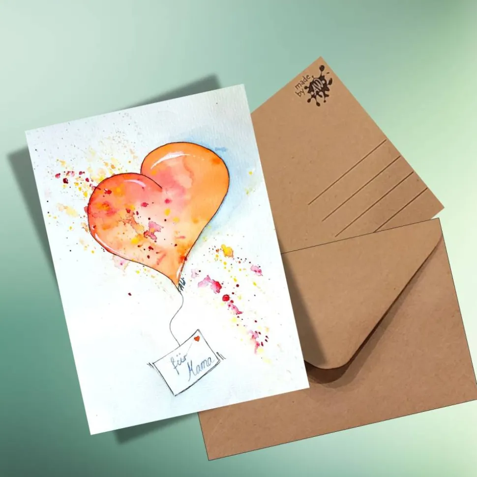 Manchmal braucht es nicht viele Worte, um Liebe auszudrücken. ♥ Diese zarte Postkarte mit einem herzförmigen Luftballon und einem Brief mit der Aufschrift „Für Mama“ ist eine herzliche Art, einfach mal Danke zu sagen. Ob zum Muttertag oder als kleine Überraschung zwischendurch – mit dieser liebevoll gestalteten Karte kannst du deiner Mama eine besondere Freude machen.