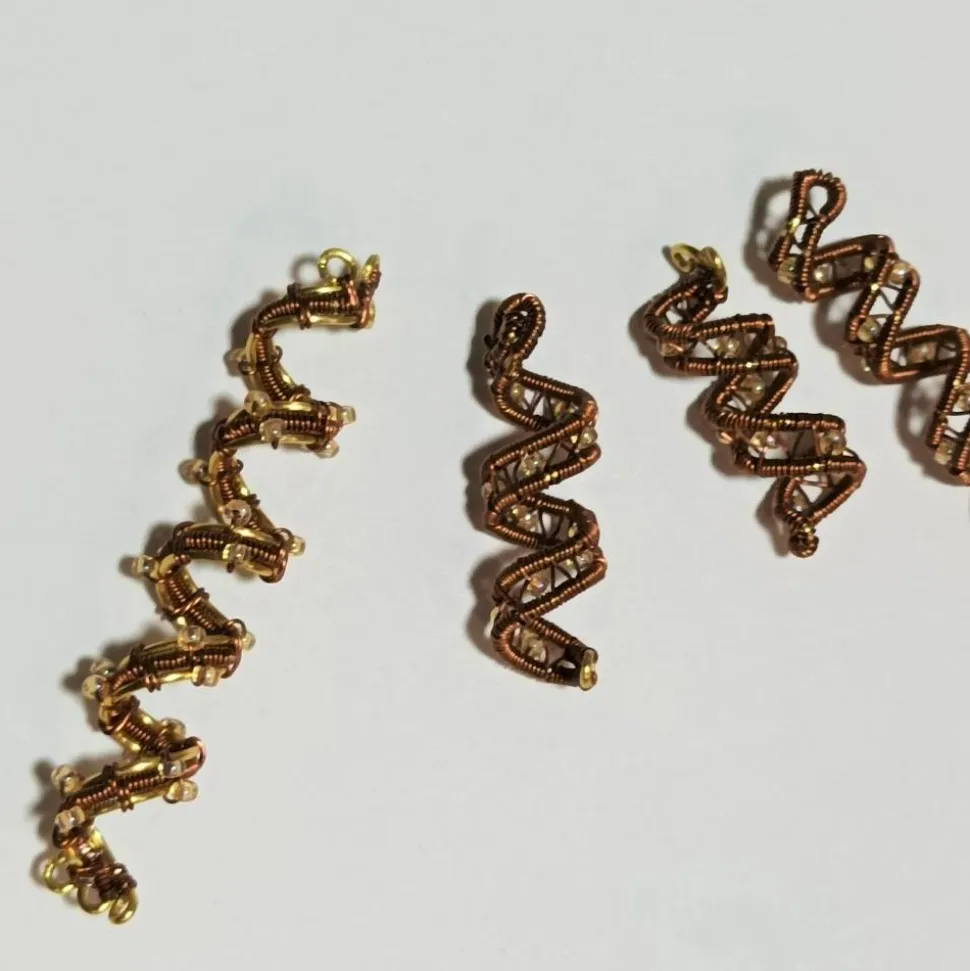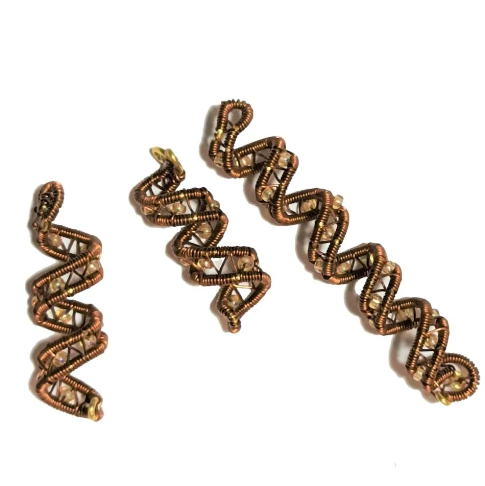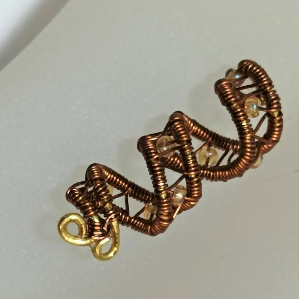 Die Haarperle ist in wirework zweifarbig kupfer auf goldfarben von Hand gewebt und mit kleinen Glasperlen in hellem gold mit Regenbogen Schimmer verziert.