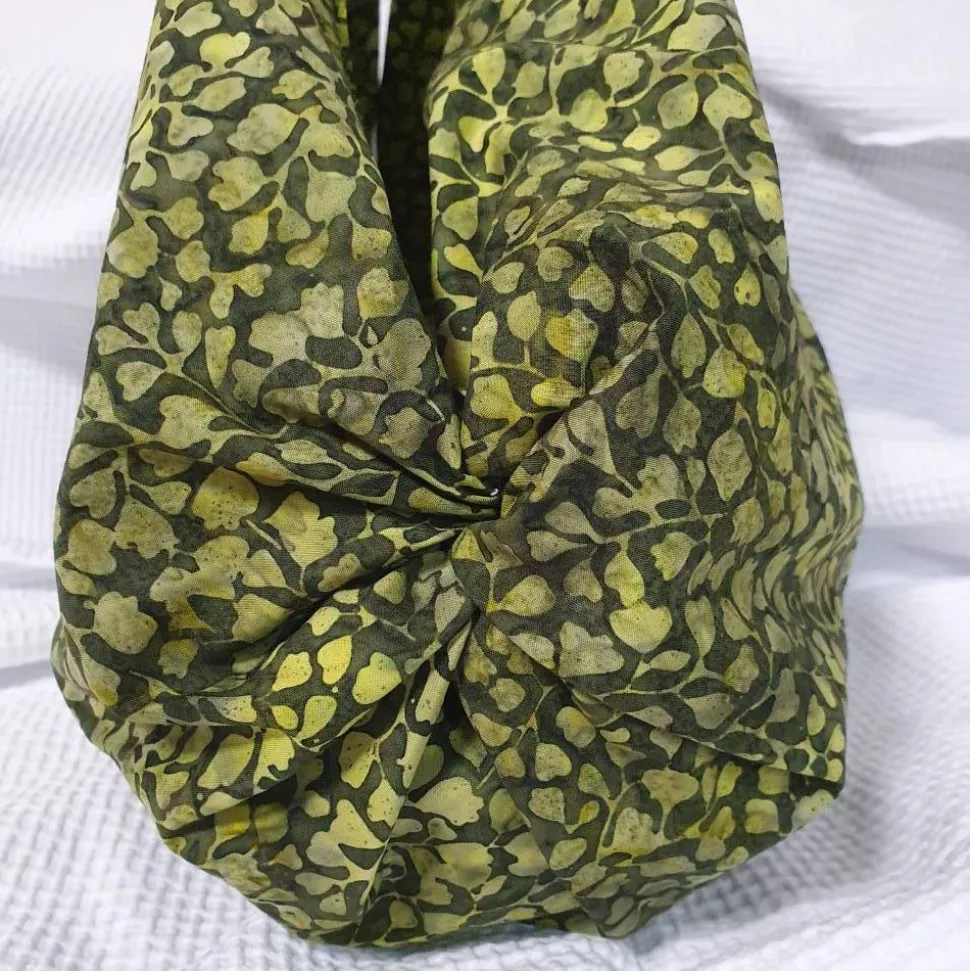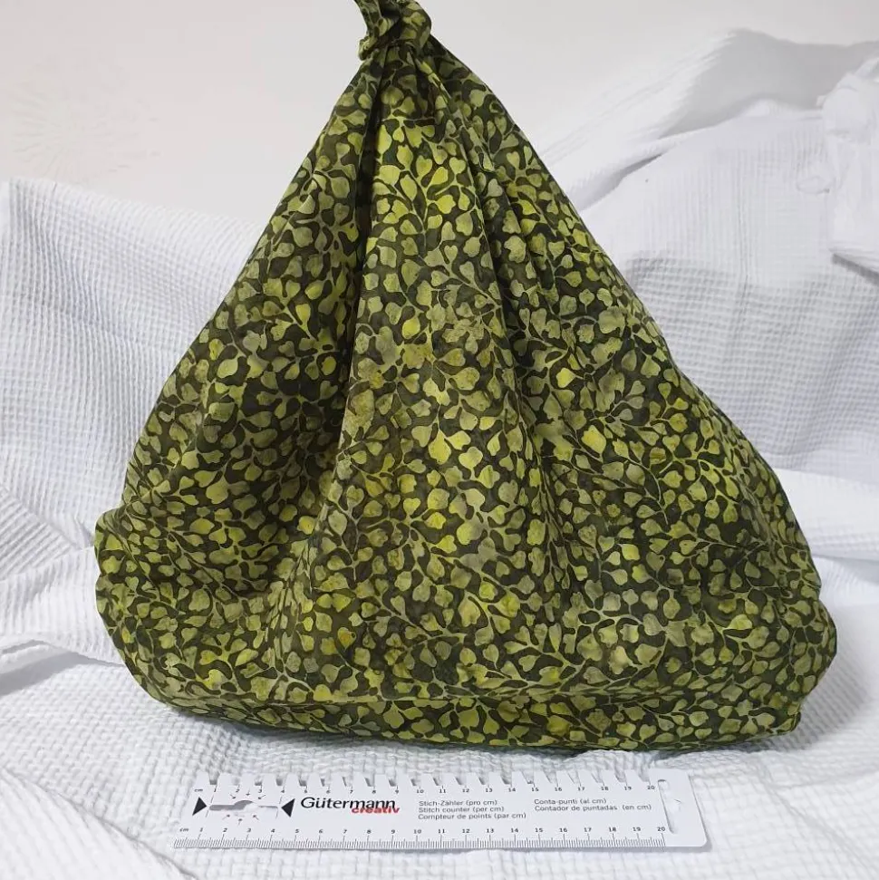 Das Blättermuster in Grüntönen – von Limette bis tiefem Oliv – wirkt sommerlich und natürlich. Rechte und linke Stoffseite unterscheiden sich kaum. Der Stoff hat leichten Stand, lässt sich gut knoten und ist sauber mit Rollsaum eingefasst, perfekt für alle, die umweltfreundlich und stilvoll verpacken möchten.