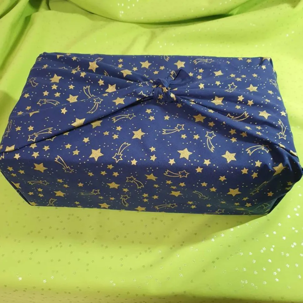 In den Fotos finden sich einige Verpackungsbeispiele. Verpackt wurden eine Schuhschachtel, ein eher quadratisches Päckchen, ein Hokkaidokürbis, 2 x 0,75 l Wein und 1 Liter Wein. Es gibt noch viel mehr Möglichkeiten, die sich fast alle mit einem Tuch dieser Größe verwirklichen lassen.