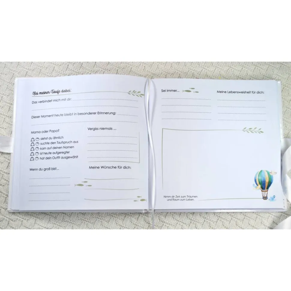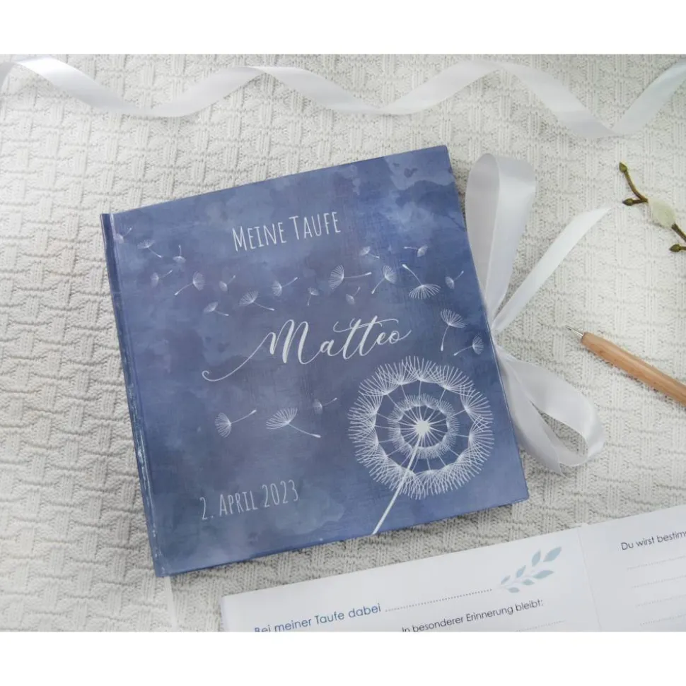 Personalisiertes Gästebuch und Erinnerungsalbum zur Taufe mit zarter Pusteblume und fliegenden Schirmchen in Weiß mit wolkigem Aquarell-Hintergrund in edlem Grau mit Seiten zum Ausfüllen und Selbstgestalten. Auch mit Fragebogen für die Gäste erhältlich.
