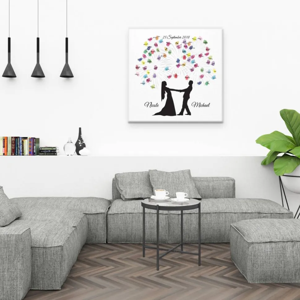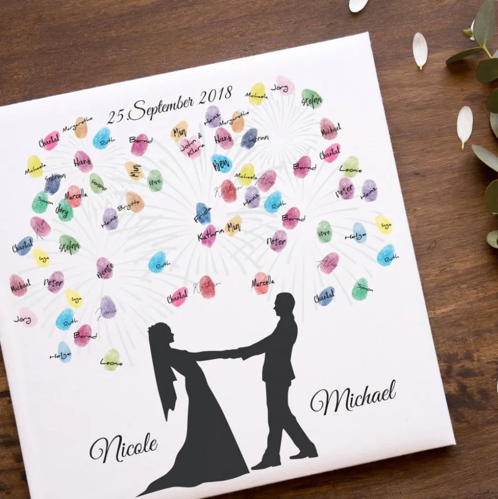 Die Gäste können mit Stempelkissen ihren Fingerabdruck auf der hochwertigen Leinwand hinterlassen und signieren. Ein einzigartiges und individuelles Hochzeitsgeschenk und Spaß auf der Hochzeitsfeier, welches noch lange in Erinnerung bleibt.