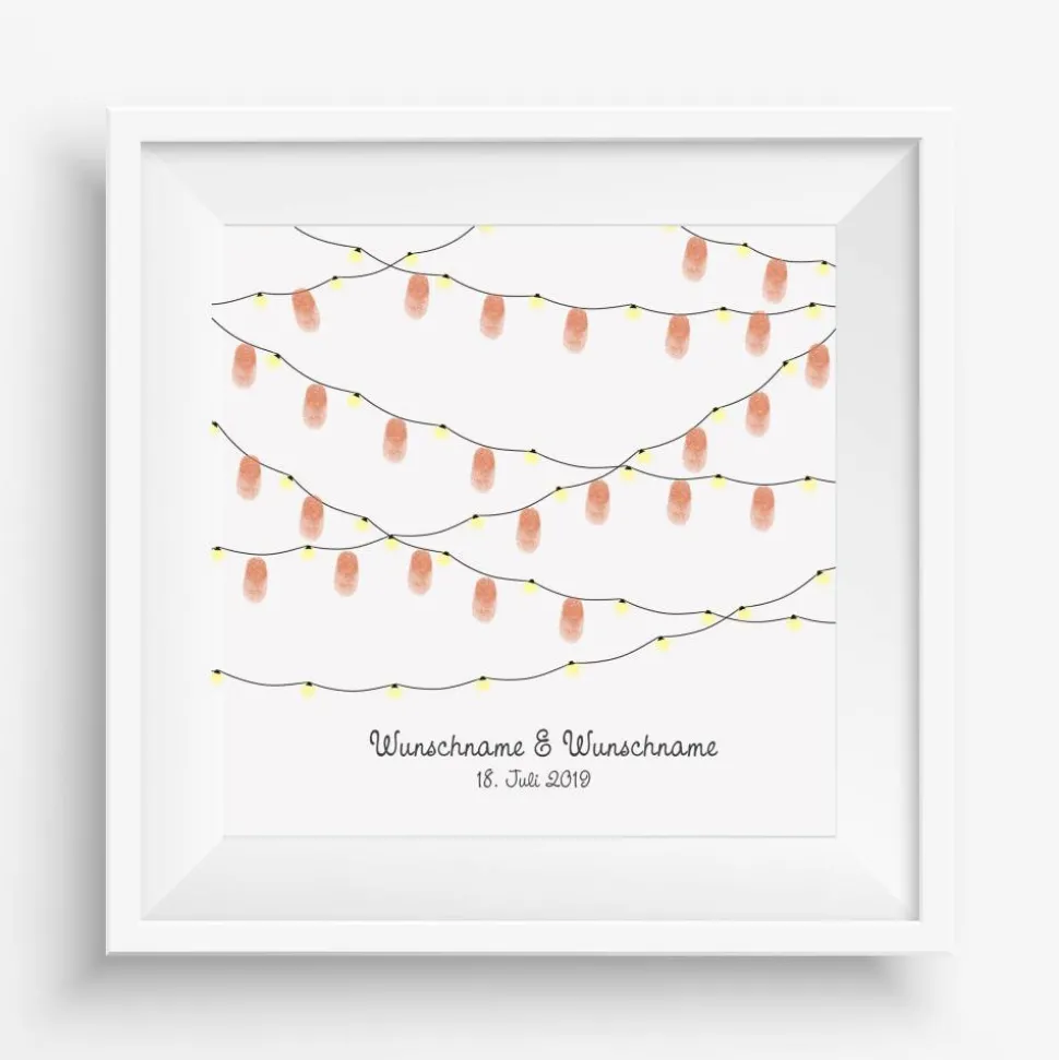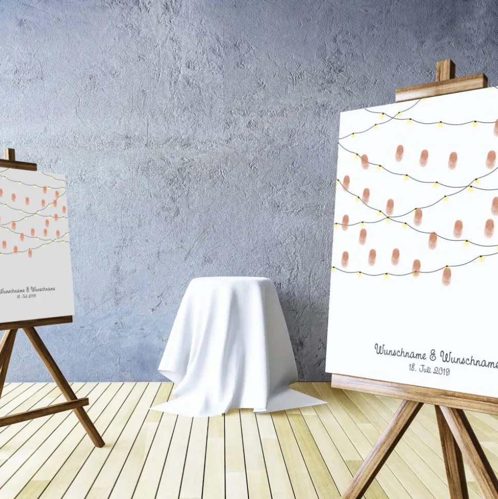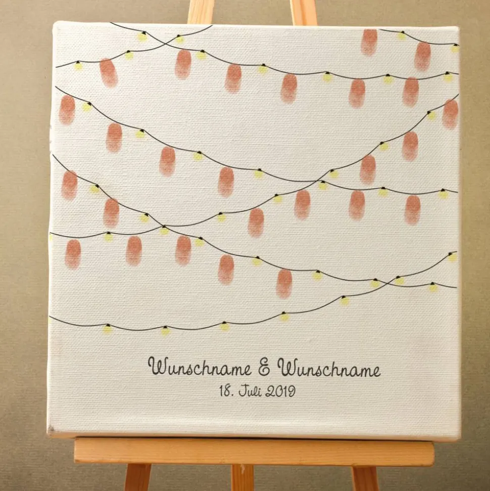 Die Gäste können mit Stempelkissen ihren Fingerabdruck auf der hochwertigen Leinwand hinterlassen und signieren. Ein einzigartiges und individuelles Hochzeitsgeschenk und Spaß auf der Hochzeitsfeier, welches noch lange in Erinnerung bleibt.