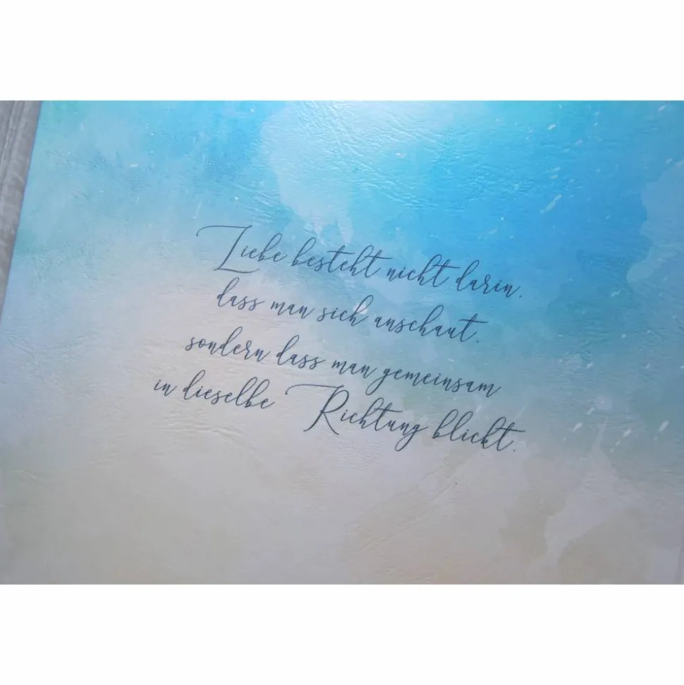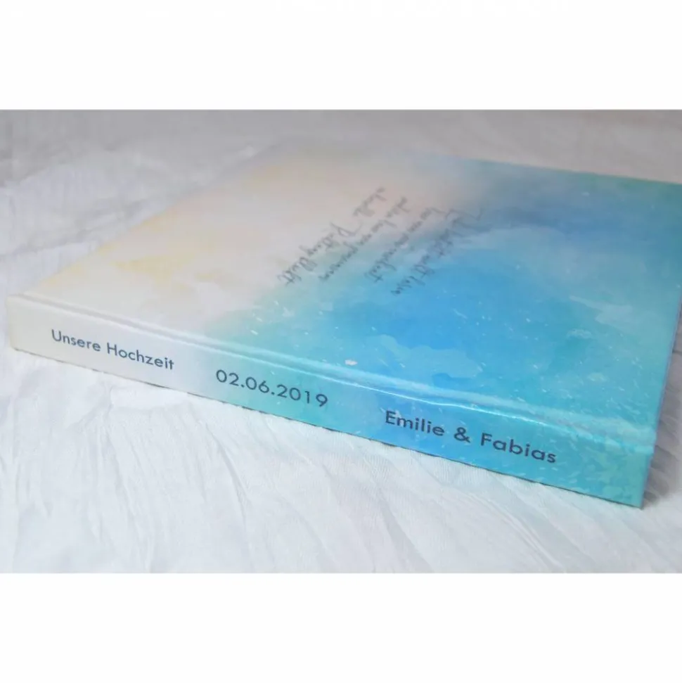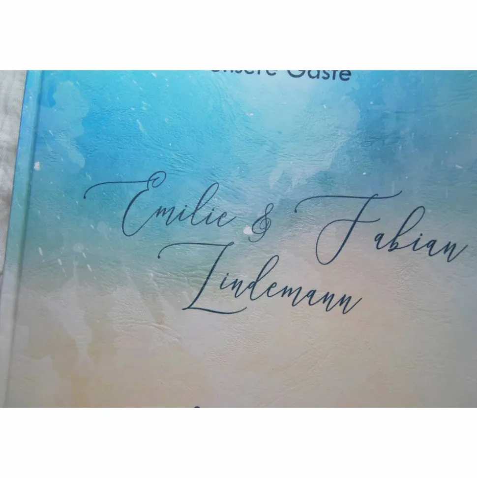 Gästebuch zur Hochzeit personalisiert mit Name, Spruch und Datum; Aquarell-Hintergrund in Himmelblau und Vanille, Kalligraphie und Handlettering, Hochzeitsgeschenk, Geschenkidee, Hochzeitsgästebuch, Hochzeitsbuch, individualisiert